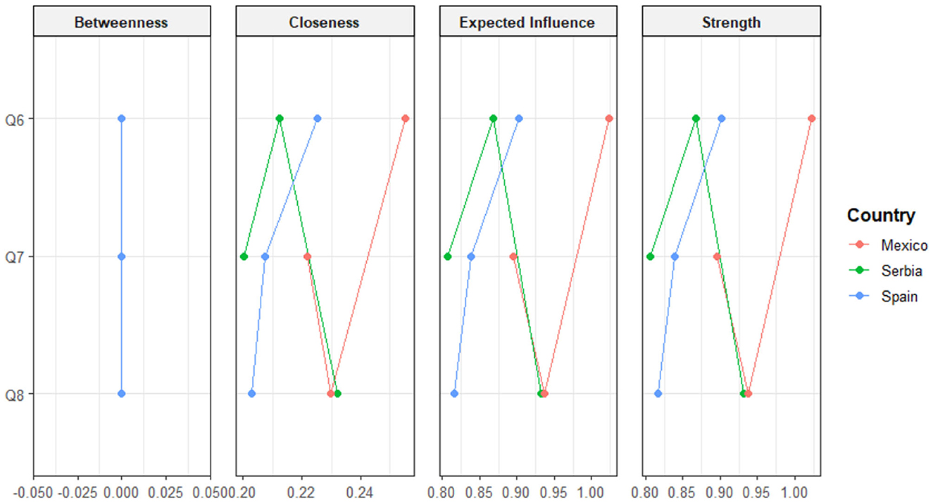 The centrality analysis allowed us to examine how student perceptions are structured around the three key dimensions. To this end, the metrics of betweenness, closeness, expected influence, and strength were used, differentiated by country (Spain, Mexico, and Serbia), as shown in Figure 5.