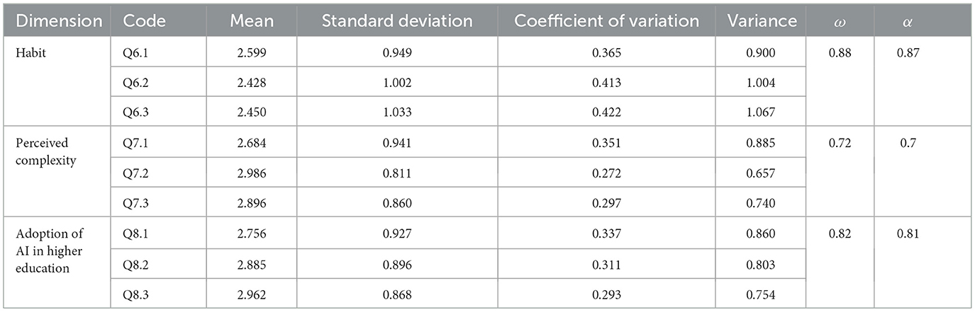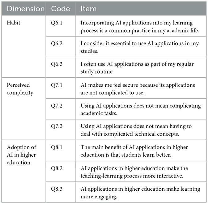 A structured questionnaire was used to collect data, consisting of a total of nine items distributed across three specific dimensions that are directly relevant to the objective: (1) habit, (2) perceived complexity, and (3) adoption of AI in higher education. Table 1 provides a detailed description of the items. The “habit” dimension assesses how often students use AI tools and the extent to which these tools are naturally integrated into their academic routines. The “perceived complexity” dimension analyzes the subjective perception of the ease or difficulty of interacting with these technologies, considering factors such as the interface, the learning curve, and the need for prior knowledge. Finally, the “AI adoption” dimension captures general perceptions regarding the positive impact of these applications on key processes in the educational environment, such as teaching, autonomous learning, and student engagement. The questionnaire used a five-point Likert scale to record responses, with options ranging from “strongly disagree” to “strongly agree”, thus allowing for nuances in the attitudes and assessments of respondents to be captured. These dimensions align with the constructs of UTAUT/UTAUT2: habit corresponds to the construct “habit” in UTAUT2, perceived complexity approximates the concept of “effort expectancy,” and adoption is linked to “performance expectancy” and the “behavioral intention” of technology adoption (Venkatesh et al., 2003, 2012).