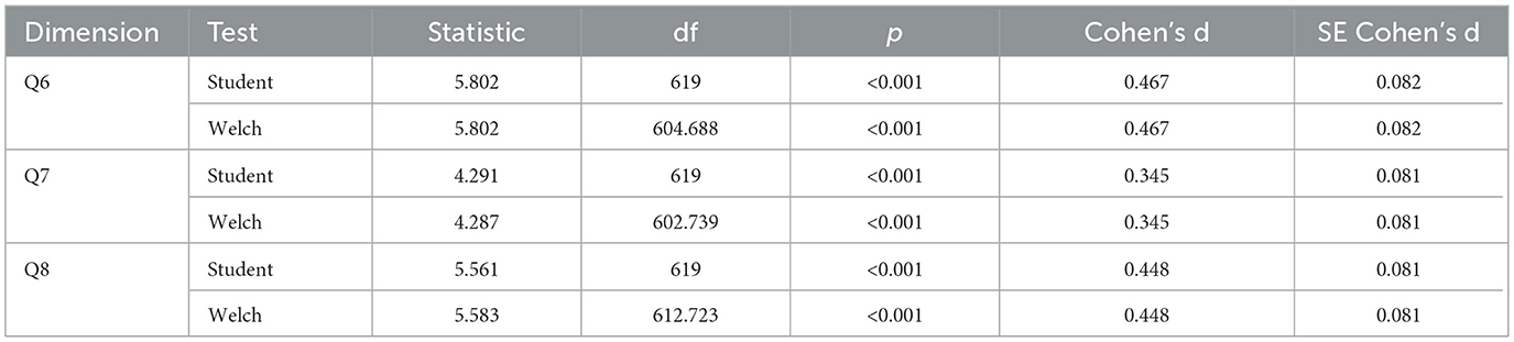 First, the Habit dimension (Q6) showed the most marked differences between the two types of institutions. Both tests reported highly significant values (p < 0.001), with a moderate effect size (Cohen's d = 0.467 in both tests), indicating that students at private universities reported significantly higher levels of AI application adoption compared to their peers at public universities. This difference is not only statistically robust but also relevant in practical terms, as it suggests greater acceptance and appreciation of AI in private settings, possibly due to greater availability of technological resources or more proactive institutional strategies.