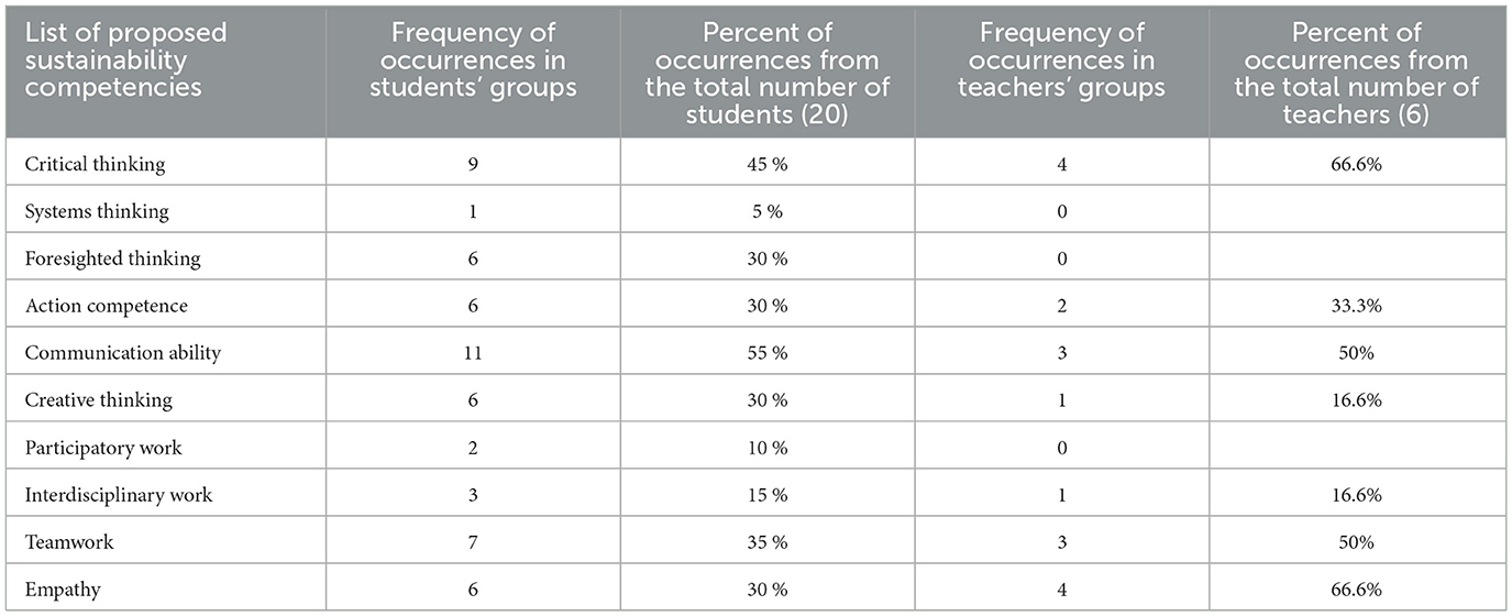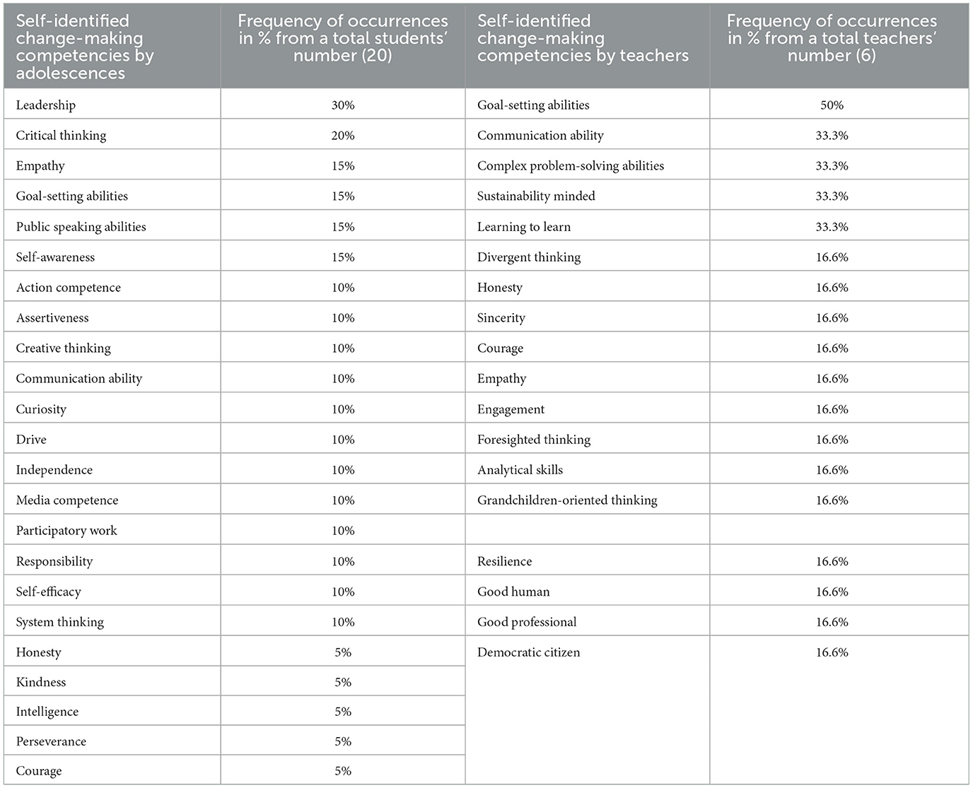 Participants were invited to discuss the competencies needed to apply sustainability principles in schools. At first phase of this exercise students and teachers reflected on which competencies or change-making skills should be developed to help young people address environmental, social, economic, cultural, and political challenges, preparing them as “change-makers” for a sustainable future. Among adolescents, leadership qualities emerged as the most frequently cited change-making competency, alongside communication, public speaking, critical thinking, and goal-setting (Table 1). “For example, if someone in school fights for others' rights and can present ideas effectively, they can inspire action” (ST4_3). “Public speaking helps to present problems and make others think” (ST1_2).