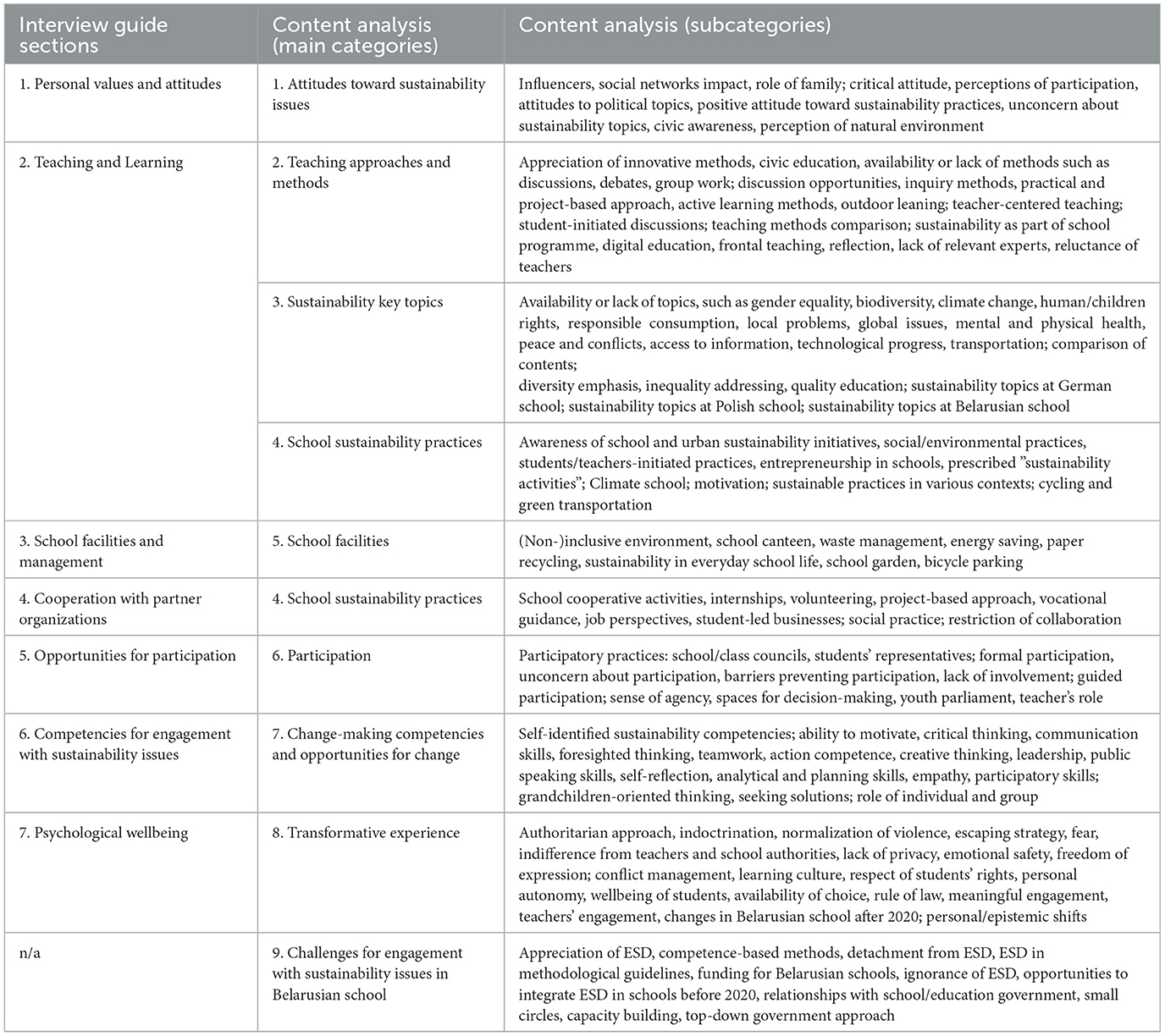 The interviews revealed diverse perspectives on the presence—and absence—of ESD practices in Belarusian schools. While student accounts were often brief and reflective of limited exposure to ESD, teachers provided nuanced insights into both structural opportunities and persistent constraints surrounding sustainability education before and after 2020. Their responses are organized into thematic categories derived through both inductive and deductive content analysis (Table 2).