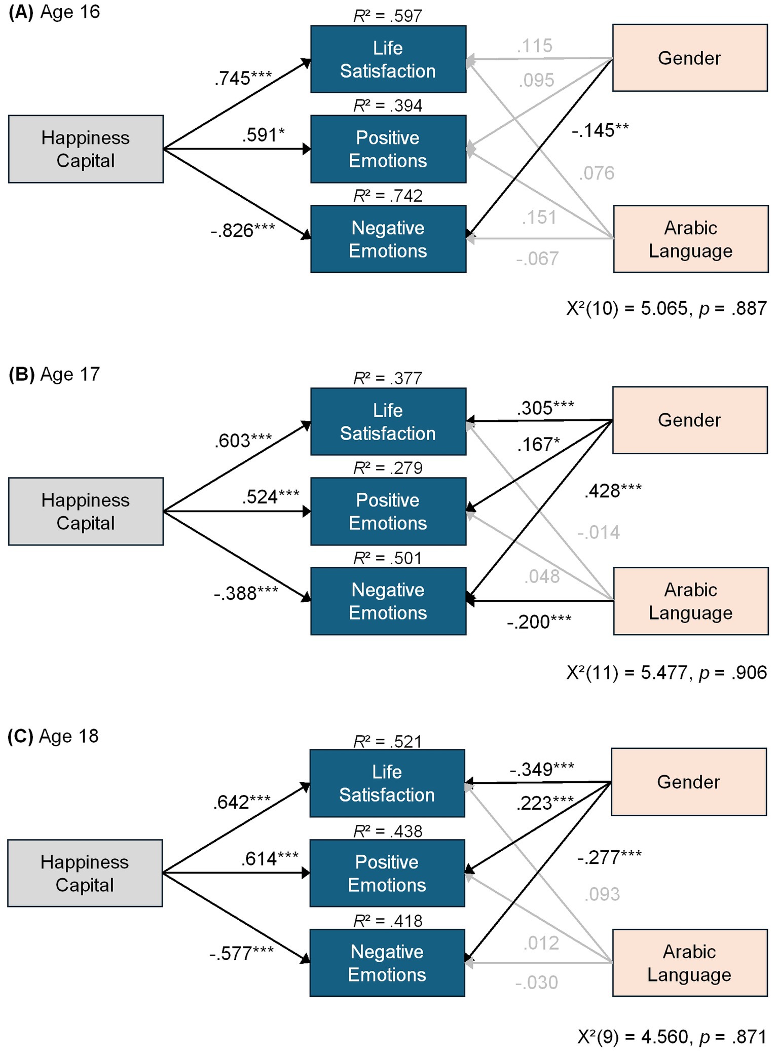Figure 1. Path analyses regarding happiness capital (IV), subjective wellbeing (DV), and gender and performance in the subject Arabic language (covariates) with standardized path coefficients. (A) Age 16. (B) Age 17. (C) Age 18. * p < 0.05, ** p < 0.01, *** p < 0.001, gray paths are nonsignificant.
