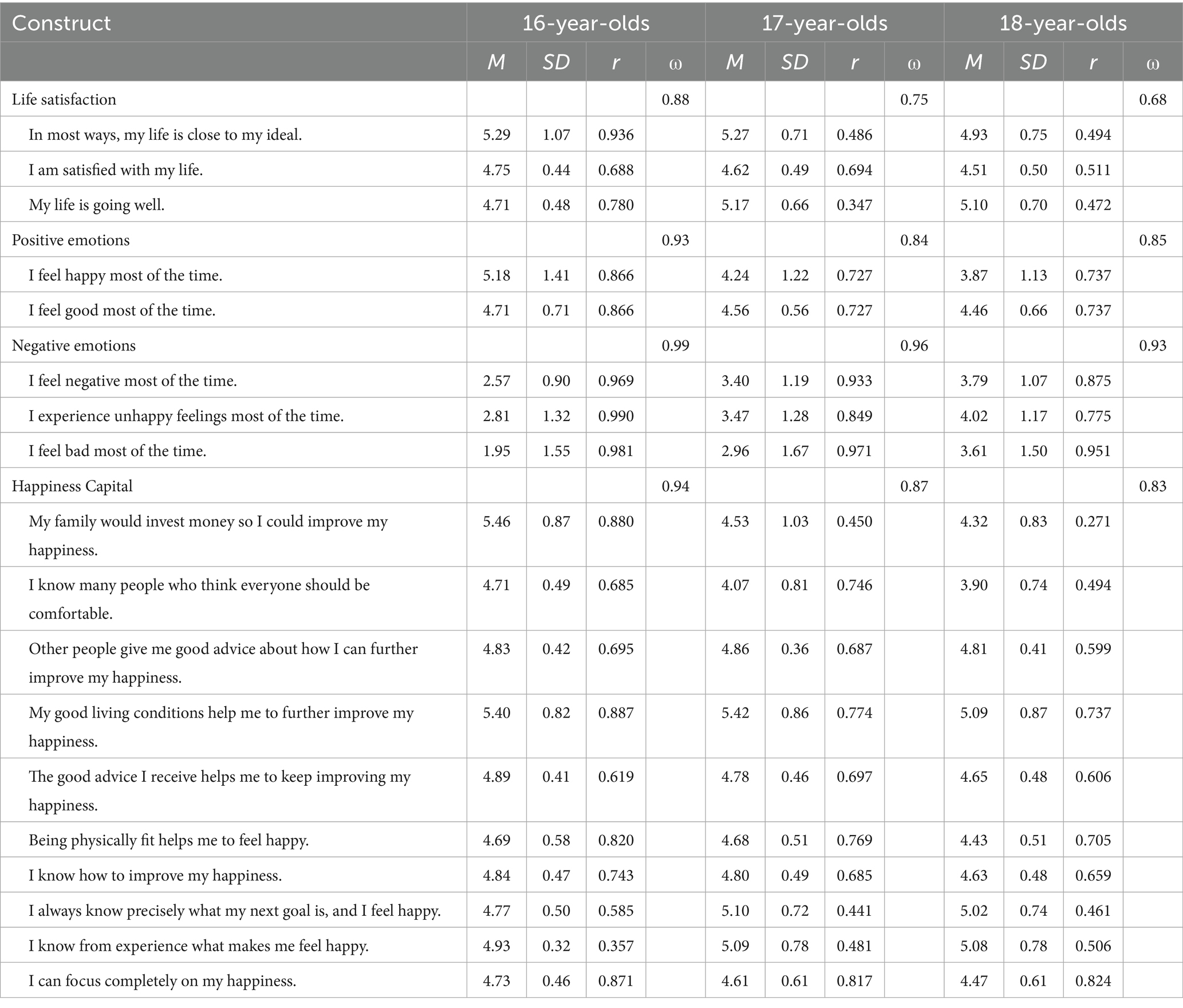 Happiness capital was assessed via an adaption of the established Questionnaire of Educational and Learning Capital (QELC) (Vladut et al., 2013). The original QELC asked students to rate the availability of educational and learning resources as a means of their learning progress. The questionnaire is based on the Actiotope Model of Giftedness (Ziegler and Baker, 2013) and distinguishes 10 learning resources (termed capitals) that need to be available and used by students to enable optimal learning (see Table 2). In the current study, students selected the extent to which they agreed with the items on a 6-point Likert scale, where 1 = strongly disagree, 2 = disagree, 3 = somewhat disagree, 4 = somewhat agree, 5 = agree, and 6 = strongly agree. All items were written in a positive voice, meaning that responses of 4 to 6 corresponded with increased availability of the corresponding capital. The QELC has been validated across numerous cultures and age groups of students (Paz-Baruch, 2015; Leana-Taşcılar, 2016; Coronel et al., 2021; Gari et al., 2021; Lafferty et al., 2021; Mendl et al., 2021). In the current adaption of the QELC to happiness, the resources are means to experiencing happiness rather than learning success, as seen in the items in Table 1. The construct showed sufficient overall reliability, and McDonald’s omega indicated a one-factor solution with one item for each resource, ω = 0.86. Additionally, it showed good internal consistency across all age groups (see Table 1).