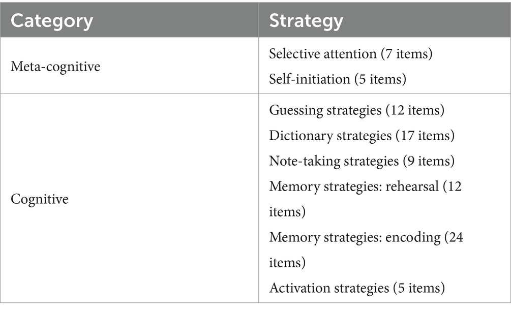 Within the two broad categories of vocabulary learning strategies (VLS), discovery strategies—as defined by Schmitt (1997)—are approaches for obtaining initial information about unfamiliar words: when learners encounter a new word, they either use target/native language knowledge, contextual clues, or reference materials to infer its meaning (termed determination strategies, abbreviated DET) or seek help from others (termed social strategies, abbreviated SOC). Determining a new word’s meaning in context is fundamental to initial exposure, yet many scholars have largely overlooked discovery strategies, often conflating them with consolidation strategies—the strategies used to retain a word’s meaning after initial learning. These consolidation strategies include social, memory, cognitive, and meta-cognitive subcategories, a framework developed by Oxford (1990) for its comprehensive organization of diverse VLS: social strategies (SOC) involve interaction with others to enhance learning; memory strategies (MEM) connect new vocabulary to existing knowledge; cognitive strategies (COG) are tools for more effective learning (e.g., repetition, contextual guessing, imagery); and meta-cognitive strategies (MET) involve conscious reflection on planning, monitoring, or evaluating learning. Given the questionnaire’s length constraints, this two-category framework (and its subcategories) was deemed sufficient for the study’s objectives.