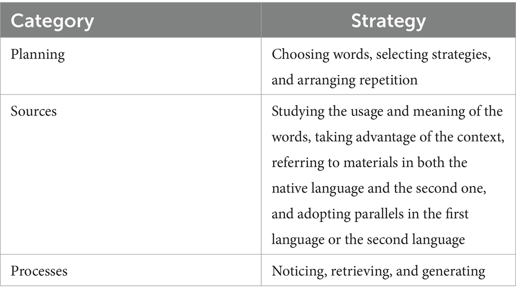 Nation (2001) offered another perspective by categorizing VLS into three functional groups: (1) Planning; (2) Sources; and (3) Processes. While this functional division clarifies strategy purposes, it lacks an explicit connection to the dynamic progression of word learning (Table 4).