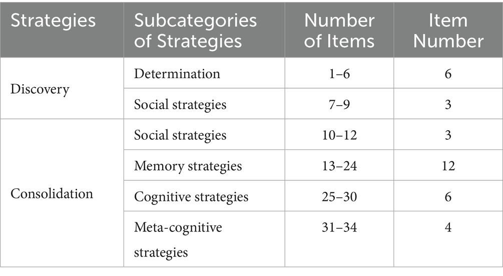 Based on the findings of the pilot study, a total of 34 vocabulary learning strategies were finalized and further categorized into subdimensions, as detailed in Table 5.