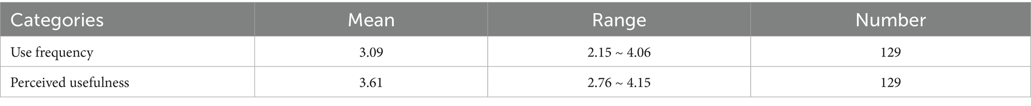 Independent samples t-tests were conducted to verify the statistical significance of these proficiency-based differences (see Table 7). Results indicate that high-level students scored significantly higher than low-level students in both use frequency (t = 2.31, p = 0.023 < 0.05) and perceived usefulness (t = 2.57, p = 0.012 < 0.05), with small-to-medium effect sizes (Cohen’s d = 0.48 for use frequency; Cohen’s d = 0.56 for perceived usefulness) confirming the practical relevance of these differences.
