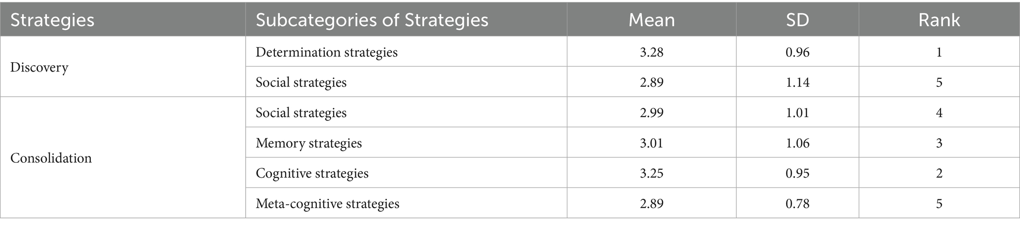 To systematically address the study’s three research questions, a mixed approach of descriptive and inferential statistics was employed, with all analyses conducted using SPSS 26.0. Descriptive statistics, specifically means (M) and standard deviations (SD), were calculated for two core variables—use frequency and perceived usefulness—across all 34 vocabulary learning strategies (VLS) and their six subcategories. Use frequency was quantified based on a 5-point Likert scale (1 = never to 5 = very often), while perceived usefulness was measured using another 5-point Likert scale (1 = not useful to 5 = extremely useful). This method was chosen because it provides a clear overview of the central tendency and dispersion of the data, enabling the identification of the most/least frequently used strategies and most/least useful strategies through mean ranking, while also laying a foundation for subsequent inferential analyses by revealing initial patterns in the data.