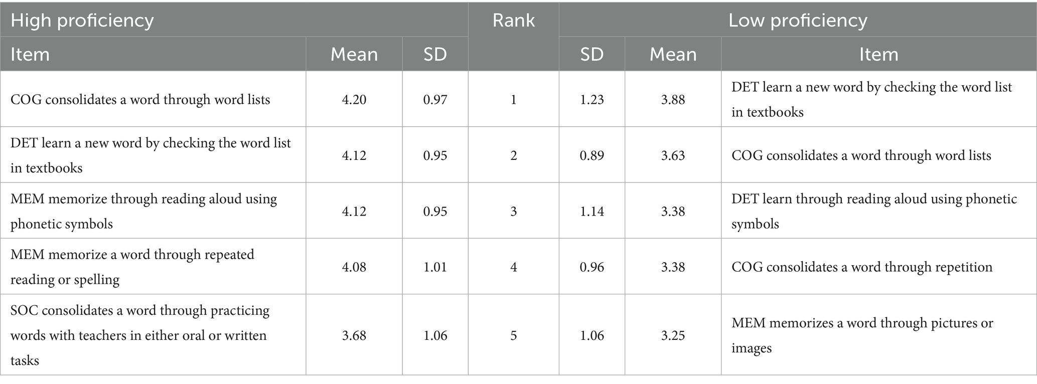 Table 8 demonstrates the mean and standard deviation of the use frequency of each item in the survey. The items are grouped and ranked by the degree of frequency. According to this table, the most frequently used strategies by participants are “DET learn a new word through checking the word list on textbooks,” “COG consolidate a word through word lists,” “MEM memorize a word through reading aloud using phonetic symbols,” “MEM memorize a word through repeated reading or spelling,” and “SOC consolidate a word through practicing words with teachers in either oral or written tasks.” Rather than other strategies, using word lists to consolidate learned words and checking the word list in textbooks to learn a new word are the most frequently used strategies.