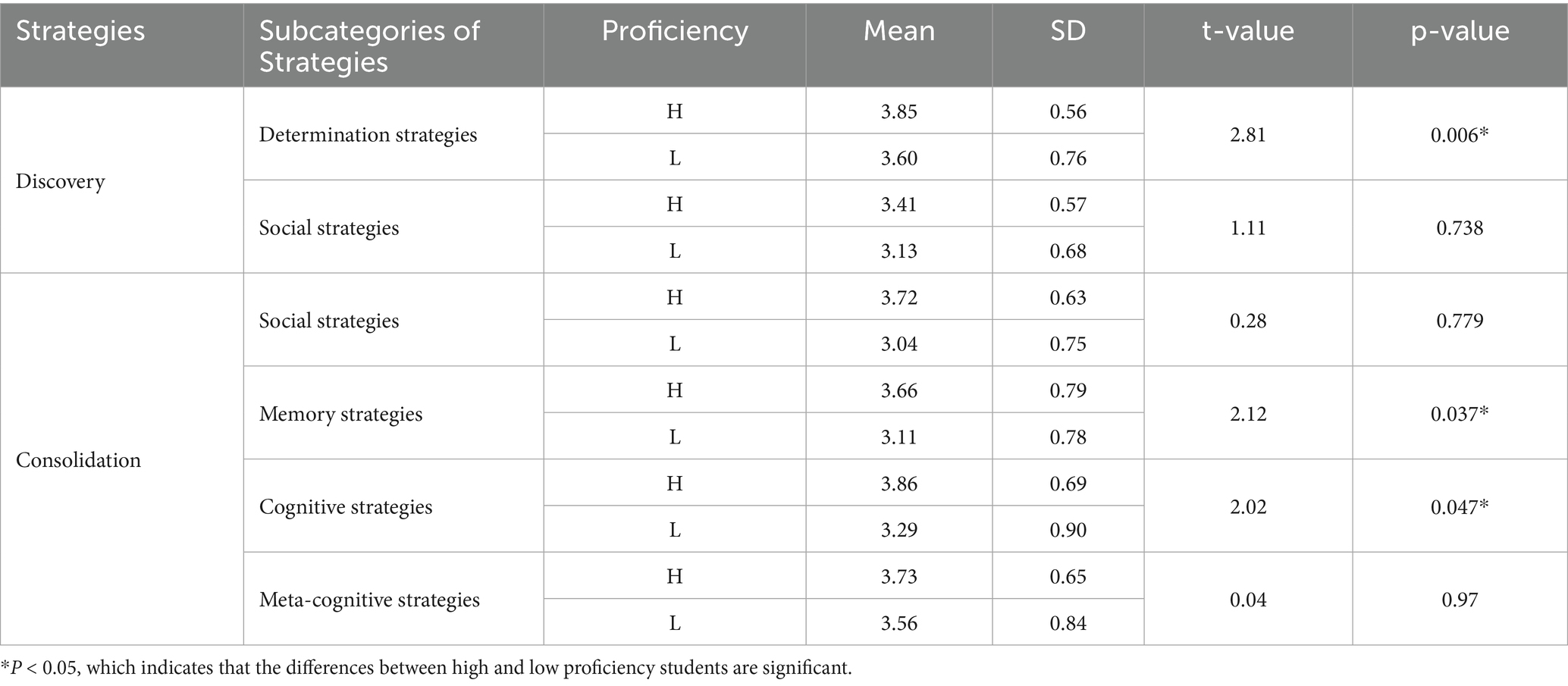 Table 11 presents the means, standard deviations (SD), and independent samples t-test results for each vocabulary learning strategy (VLS) subcategory, comparing high-proficiency (H) and low-proficiency (L) students in terms of use frequency. As shown, high-proficiency students used nearly all strategy subcategories more frequently than low-proficiency students—with the exception of meta-cognitive strategies—which aligns with the preliminary proficiency-based differences in Table 7; a closer look at meta-cognitive strategies reveals low-proficiency students scored higher on Item 33 (“MET consolidate a word through consciously choosing or adjusting strategies,” H: M = 2.68 vs. L: M = 3.25), though the t-test confirms this subcategory difference is non-significant (t = −0.057, p = 0.955 > 0.05). Independent samples t-tests further indicate significant differences in four subcategories: discovery-determination strategies, discovery-social strategies, consolidation-social strategies, and consolidation-memory strategies, while cognitive strategies showed no significant proficiency-based gap.