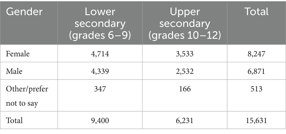 A total of 15,631 lower and upper secondary school students participated in the survey, including 9,400 (60.1%) lower secondary students and 6,231 (39.9%) upper secondary students. The distribution of respondents across grade levels was as follows: Grade 6–2,397 students (15.3%), Grade 7–2,362 students (15.1%), Grade 8–2,361 students (15.1%), Grade 9–2,280 students (14.6%), Grade 10–2,602 students (16.6%), Grade 11–1928 students (12.3%), and Grade 12–1701 students (10.9%). Of the respondents, 8,247 (52.8%) identified as female and 6,287 (44.0%) as male, while 513 students (3.3%) selected “other/prefer not to say” (see Table 1). Respondents were distributed across three school types: 5965 students (38.2%) from basic schools, 5,076 (32.5%) from combined upper secondary schools, and 4,590 (29.4%) from state-run upper secondary schools.