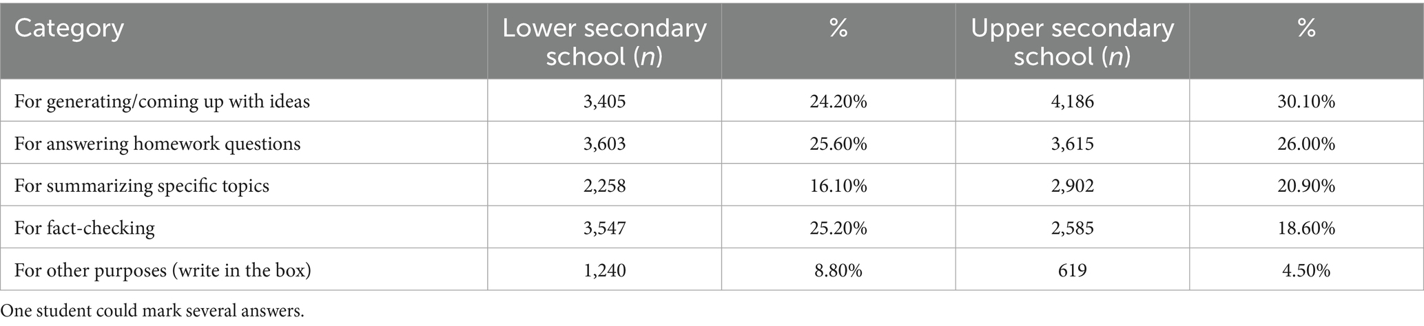 Table 2 presents students’ reported purposes for using AI tools across two educational levels: basic school (grades 6–9) and upper secondary school (grades 10–12). The most frequently reported uses among both groups were for answering homework questions and generating ideas, with over 3,600 responses in each group. These were followed by fact-checking, particularly prominent among basic school students (n = 3,547), while upper secondary students used AI more often for summarizing specific topics (n = 2,902). In addition to the predefined categories, students were invited to describe other ways they use AI tools for learning. Among basic school students, notable uses included image generation, translation tasks, and developing reaction speed. Students also mentioned checking assignments. Among upper secondary school students, image generation was the most frequently mentioned additional use. Other responses indicated using AI for creative tasks, such as producing visuals for presentations or projects (Table 3).
