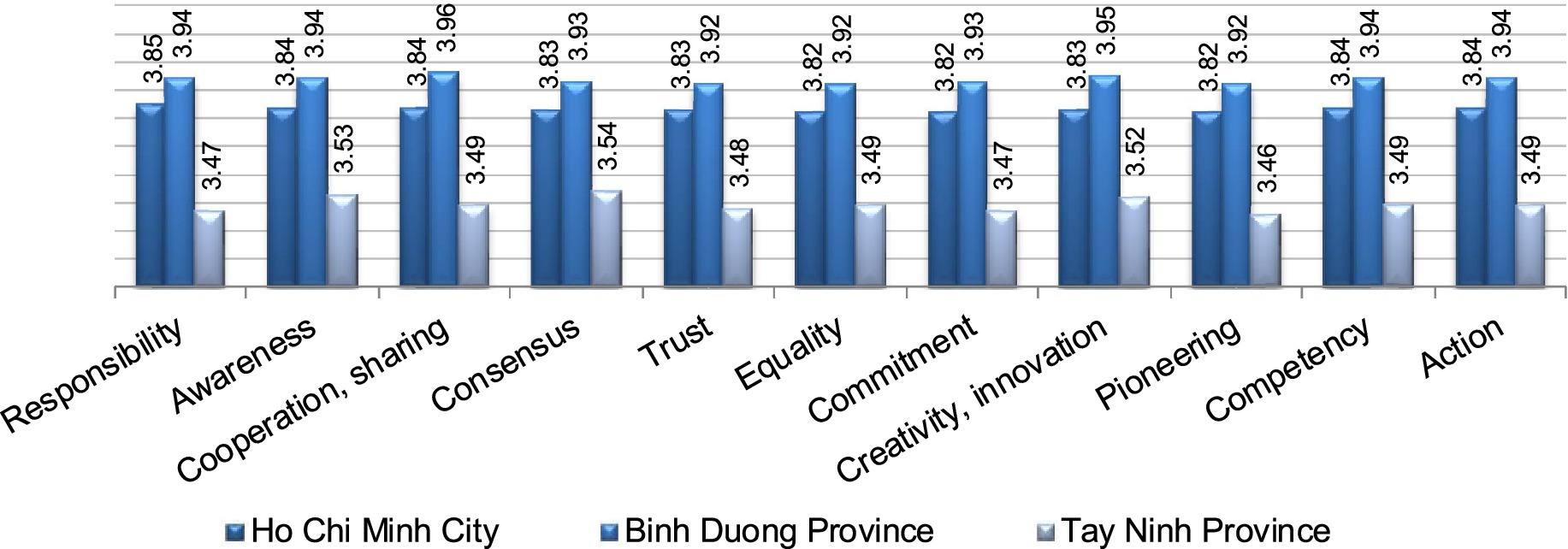 The survey results on the 11 quality cultural values of the collective show mean values (ranging from >3.4 to 4.2) at the “Very influential” level, with managers and teachers in Ho Chi Minh City and Binh Duong Province rating higher than those in Tay Ninh Province, with Binh Duong Province being the highest. The mean values in Ho Chi Minh City, Binh Duong Province, and Tay Ninh Province are from 3.82 to 3.85, from 3.92 to 3.96, and from 3.46 to 3.54, respectively. The mean values among the 11 quality cultural values in each city/province are quite similar.