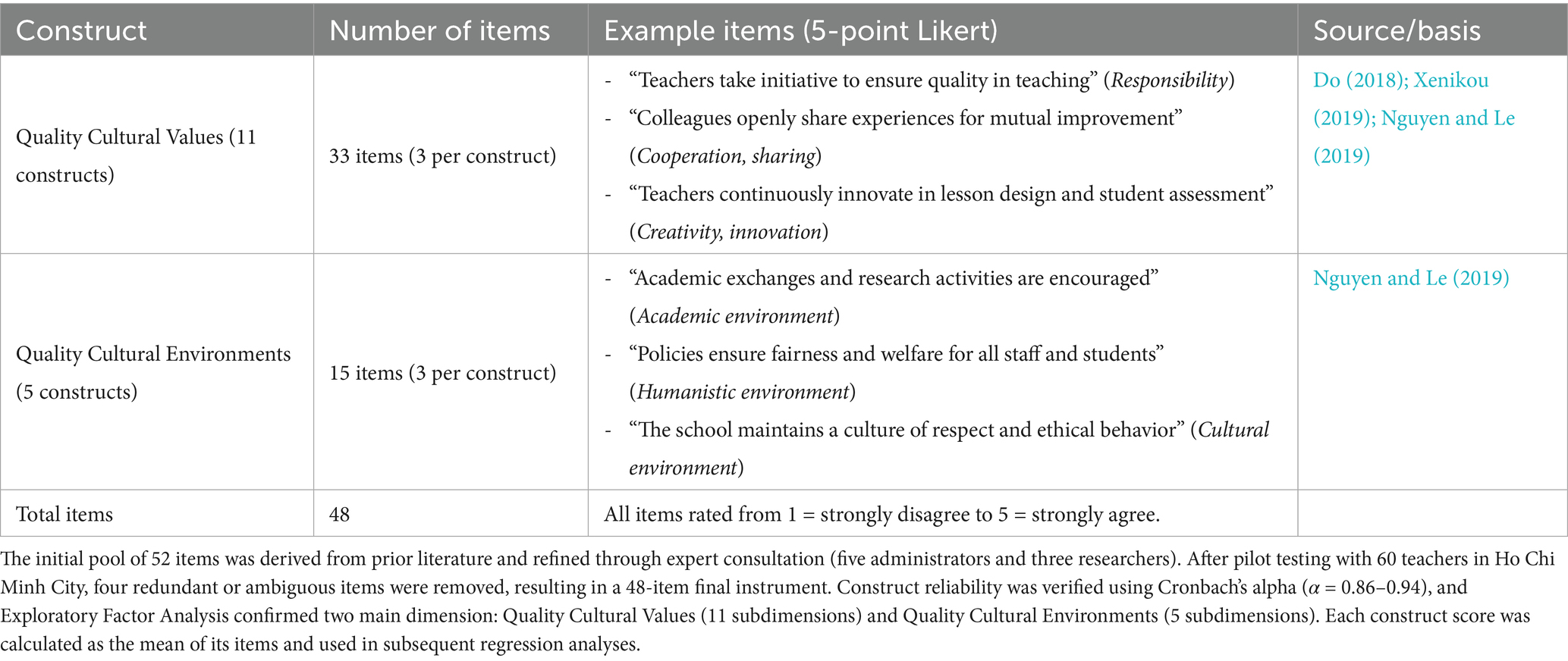 The questionnaire was developed from Nguyen and Le’s (2019) quality-culture framework and refined through expert consultation with five educational administrators and three university researchers. A pilot test with 60 secondary-school teachers in Ho Chi Minh City ensured clarity and content validity.