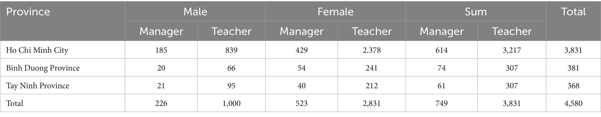For the quantitative method, the researcher surveyed 749 managers and 3,831 teachers using questionnaires in public secondary schools in Ho Chi Minh City, Binh Duong Province, and Tay Ninh Province, with the number of managers and teachers participating in the survey shown in Table 1. A convenient sampling method was used to select the three provinces that fit the research objectives and ensure a minimum sample size.