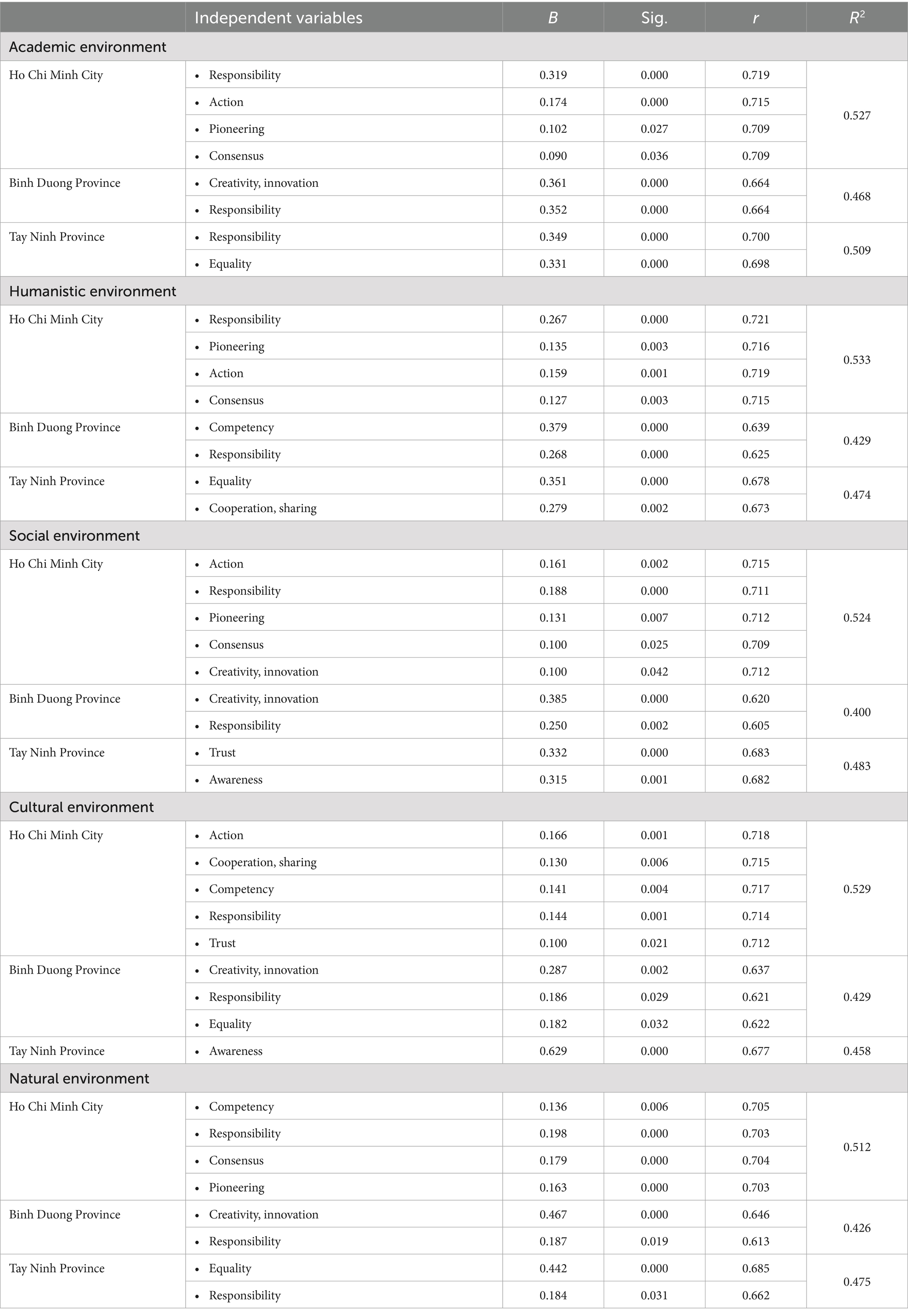 Based on the t-test (Coefficients), the regression coefficients of each independent variable are evaluated. In Ho Chi Minh City, 1 of 11 independent variables (Responsibility) has a significance level of Sig. < 0.05 influencing all 5 dependent variables; 2 of 11 independent variables (Consensus and Pioneering) have a significance level of Sig. <0.05 influencing 4 of 5 dependent variables (Academic environment, Humanistic environment, Social environment, and Natural environment); 1 of 11 independent variables (Action) has a significance level of Sig. <0.05 influencing 4 of 5 dependent variables (Academic environment, Humanistic environment, Social environment, and Cultural environment); 1 of 11 independent variables (Competency) has a significance level of Sig. < 0.05 influencing 2 of 5 dependent variables (Cultural environment and Natural environment); 1 of 11 independent variables (Creativity, innovation) has a significance level of Sig. <0.05 influencing 1 of 5 dependent variables (Social environment); 1 of 11 independent variables (Cooperation, sharing) has a significance level of Sig. <0.05 influencing 1 of 5 dependent variables (Cultural environment), and 1 of 11 independent variables (Trust) has a significance level of Sig. <0.05 influencing 1 of 5 dependent variables (Cultural environment). In Binh Duong Province, 1 of 11 independent variables (Responsibility) has a significance level of Sig. <0.05 influencing all 5 dependent variables; 1 of 11 independent variables (Creativity, innovation) has a significance level of Sig. <0.05 influencing 4 of 5 dependent variables (Academic environment, Social environment, Cultural environment, and Natural environment); 1 of 11 independent variables (Equality) has a significance level of Sig. <0.05 influencing 1 of 5 dependent variables (Cultural environment), and 1 of 11 independent variables (Competency) has a significance level of Sig. <0.05 influencing 1 of 5 dependent variable (Humanistic environment). In Tay Ninh Province, 1 of 11 independent variables (Equality) has a significance level of Sig. <0.05 influencing 3 of 5 dependent variables (Academic environment, Humanistic environment, and Natural environment); 1 of 11 independent variables (Responsibility) has a significance level of Sig. <0.05 influencing 2 of 5 dependent variables (Academic environment and Natural environment); 1 of 11 independent variables (Awareness) has a significance level of Sig. <0.05 influencing 2 of 5 dependent variables (Social environment and Cultural environment); 1 of 11 independent variables (Cooperation, sharing) has a significance level of Sig. <0.05 influencing 1 of 5 dependent variables (Humanistic environment); and 1 of 11 independent variable (Trust) has a significance level of Sig. <0.05 influencing 1 of 5 dependent variables (Social environment).