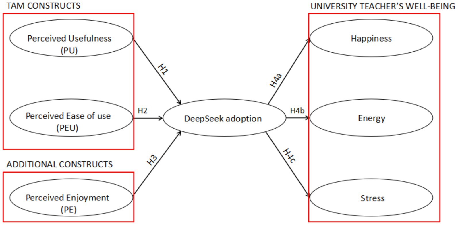 Building on these insights, this study applies an extended TAM framework to examine how perceived usefulness, ease of use, and enjoyment influence university teachers’ adoption of DeepSeek. It further investigates how adoption affects three dimensions of faculty well-being: stress, happiness, and energy. Methodologically, the study employs both structural equation modeling (SEM) and fuzzy-set qualitative comparative analysis (fsQCA) to provide complementary insights into linear and configurational relationships. In doing so, it contributes by foregrounding the underexplored faculty perspective, extending TAM with well-being constructs, and demonstrating a dual-method approach to understanding AI adoption in higher education.