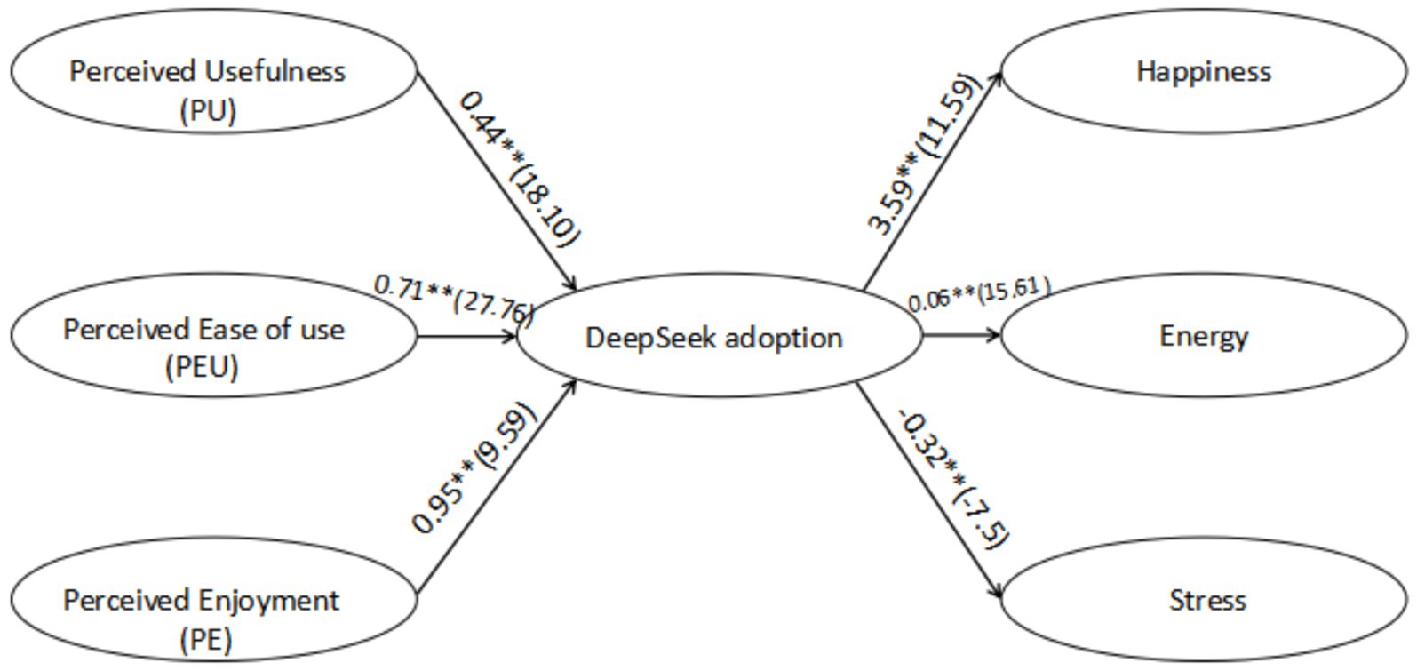 Diagram showing the factors influencing DeepSeek adoption with numerical coefficients. Arrows connect perceived usefulness, ease of use, and enjoyment to DeepSeek adoption. Arrows from DeepSeek adoption point to happiness, energy, and stress, indicating relationships.