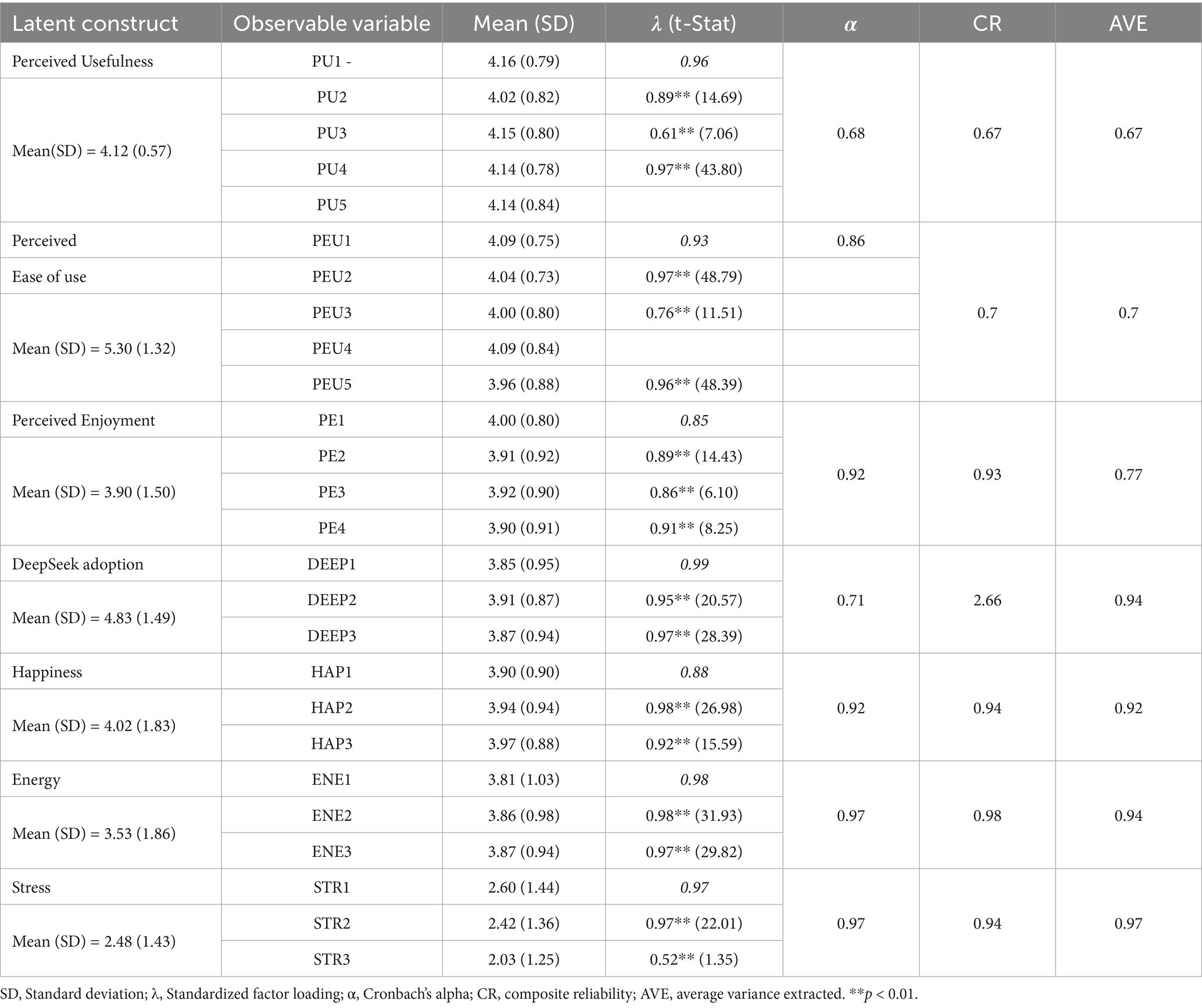 The psychometric properties of the measurement scales were first assessed. Cronbach’s α values ranged from 0.68 to 0.84. While most constructs exceeded the recommended threshold of 0.70, the α for perceived usefulness (0.68) was marginal but still considered acceptable for exploratory research (Hair et al., 2019). Factor loadings were consistently above 0.71, supporting item reliability (Tabachnick and Fidell, 2007).