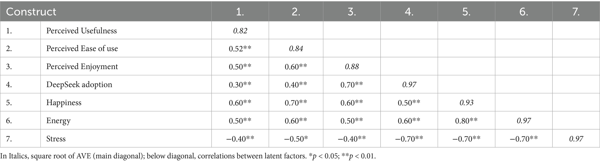 Discriminant validity was established by comparing the square root of AVE with the inter-construct correlations. As shown in Table 2, the square root of AVE values (main diagonal) were greater than inter-construct correlations, confirming discriminant validity (Fornell and Larcker, 1981).
