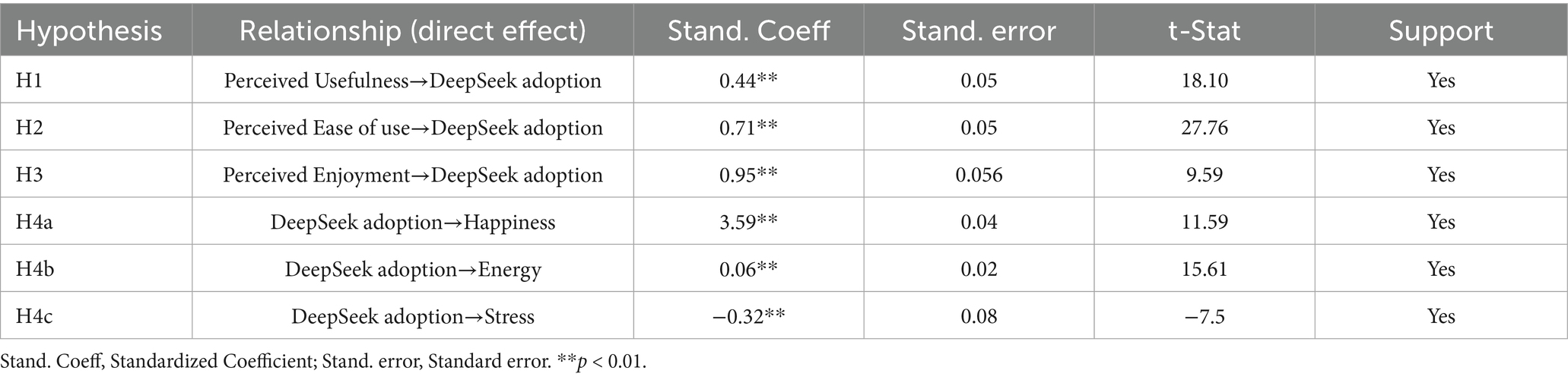 This multidimensional perspective echoes recent calls for a more nuanced evaluation of how digital technologies influence academic work (Zawacki-Richter et al., 2024). AI tools such as DeepSeek may have contradictory effects: on one hand, reducing repetitive tasks and providing teaching support could enhance happiness and energy; on the other hand, constant adaptation pressures and evolving student expectations may elevate stress. This dual potential underscores the importance of investigating adoption outcomes through a well-being lens, rather than limiting analysis to performance or efficiency.
