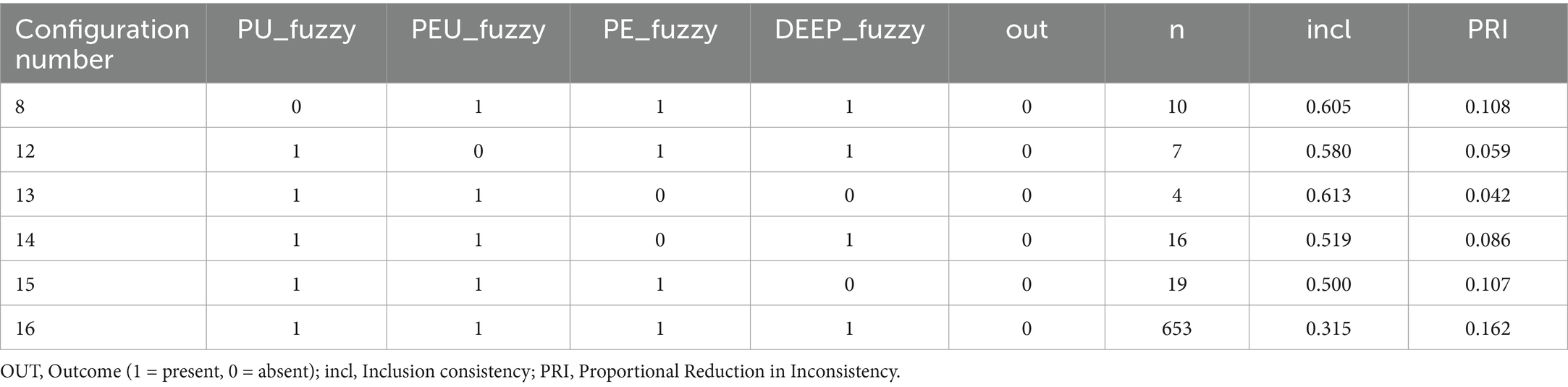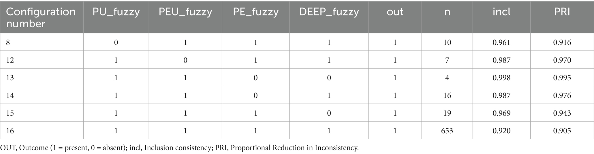 The energy outcome showed slightly lower inclusion scores (≥ 0.920) but still indicated multiple sufficient pathways. Full engagement with DeepSeek (usefulness, ease of use, enjoyment, and adoption) consistently predicted higher energy (Configuration 16). Interestingly, some pathways suggested that ease of use alone, even without high adoption, helped sustain energy. This points to the importance of usability in supporting faculty vitality (Table 5).