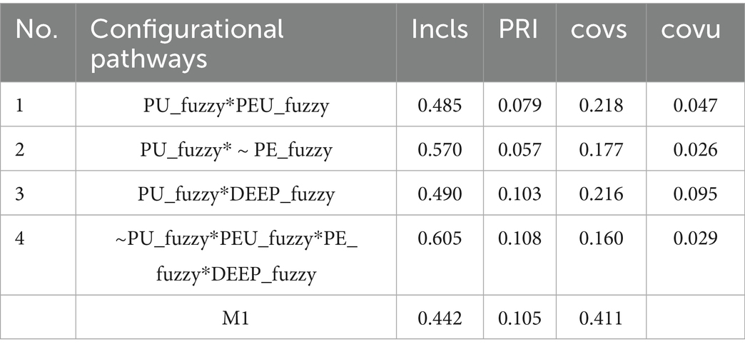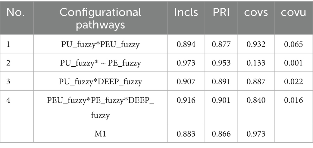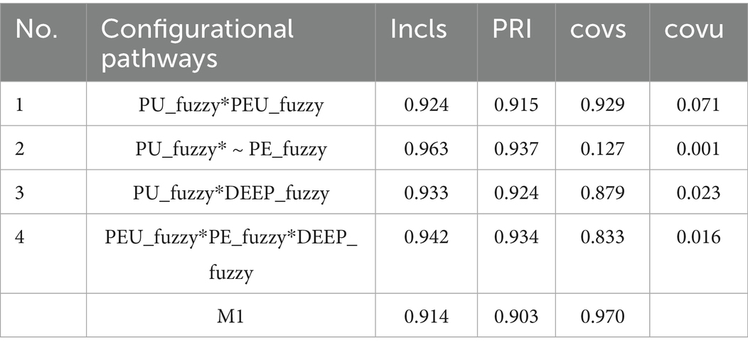 To complement SEM and explore alternative adoption pathways, fsQCA was conducted. Following Ragin (2014), raw Likert-scale responses (1–5) were calibrated into fuzzy-set membership scores ranging from 0 (full non-membership) to 1 (full membership), with 3 as the crossover point (0.5). This direct calibration method is widely used in educational and organizational research (Fiss, 2011; Schneider and Wagemann, 2012).