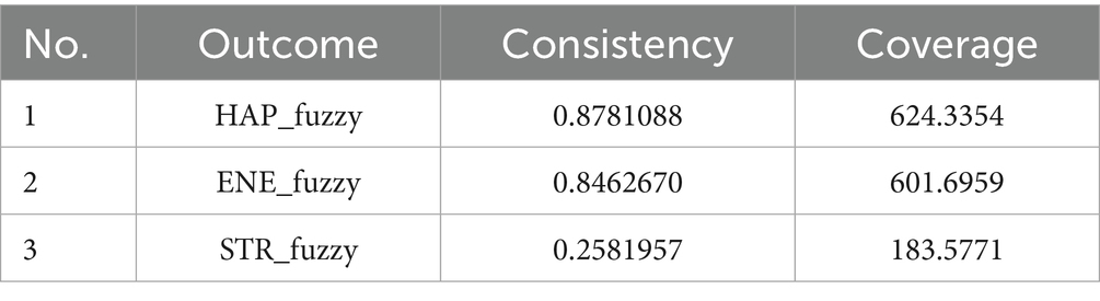 A truth table was constructed using a consistency threshold of 0.75 and a raw coverage threshold of 0.50, reflecting commonly accepted cutoffs in fsQCA studies (Fiss, 2011; Schneider and Wagemann, 2012). Necessity analysis was also performed to assess whether individual conditions consistently appeared across high well-being outcomes.