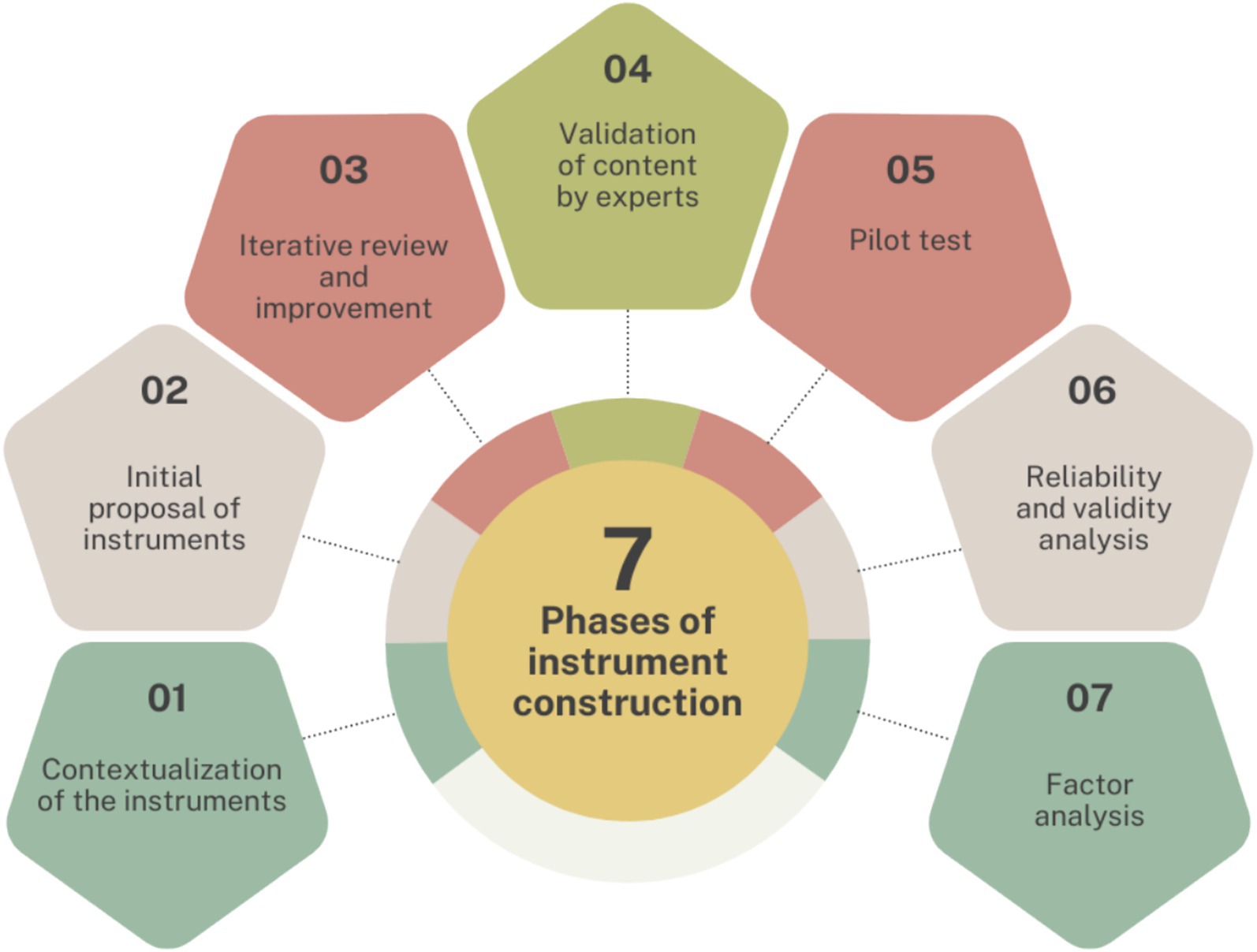 The construction of the measurement instruments was methodologically guided by seven phases: contextualization, initial proposal, iterative improvement, validation by experts, pilot test, reliability analysis and factor analysis. Measurement instruments were developed based on a previous methodological theoretical model, which through its 8 dimensions of analysis and its 4 DT components, allowed obtaining a comprehensive view of digital maturity in HEIs.