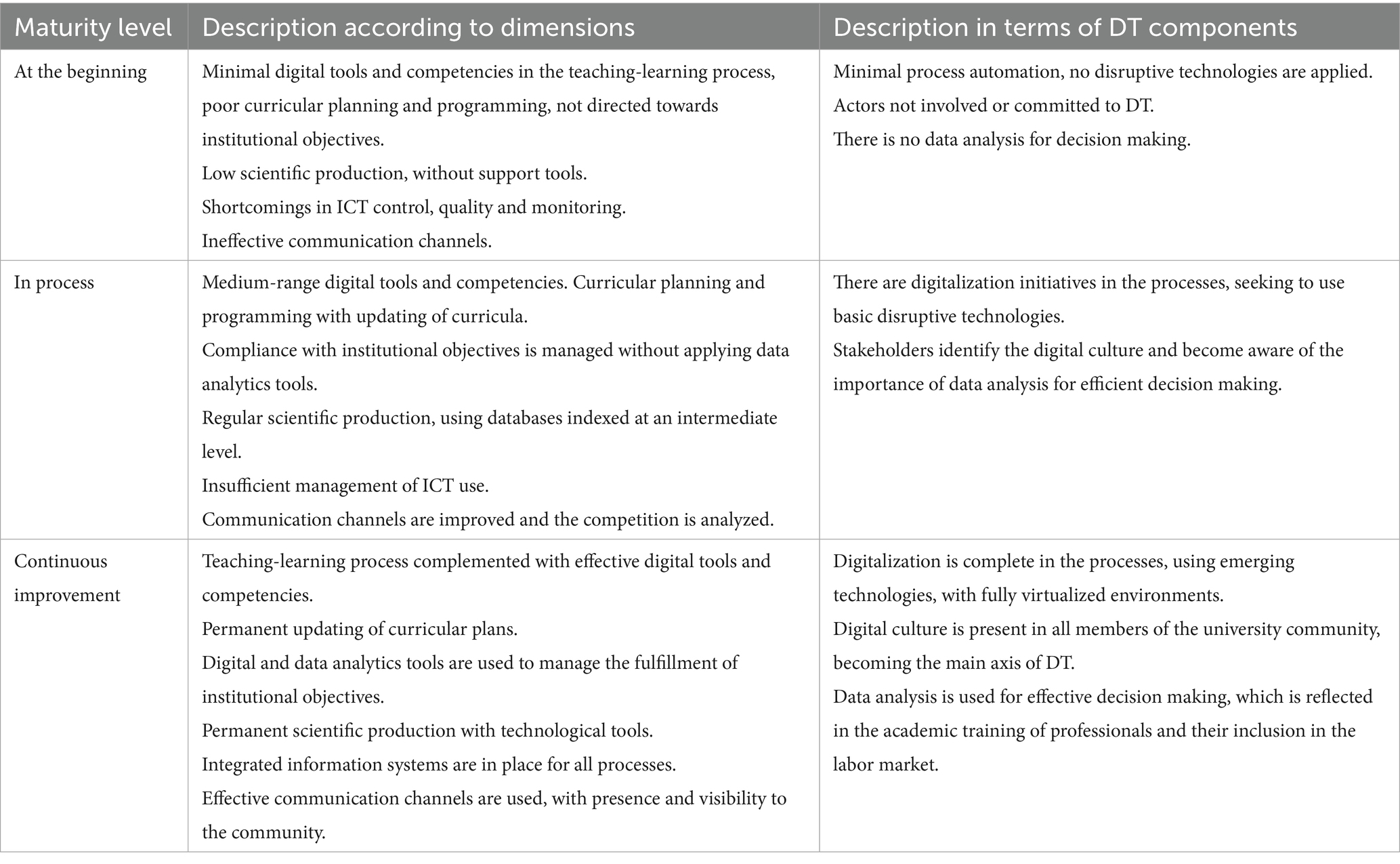 In the field of HEIs, measuring the level of DT maturity represents an opportunity to improve the digital capabilities of the academic environment, thus Tsimpanis et al. (2023) considers that a data-based framework to assess how digitally prepared HEIs are, will allow to know the willingness to adopt digital technologies and optimize educational policies based on the results obtained, with which the quality of education focuses on progressive and permanent improvements, as well as supporting the needs of students, teachers and administrative staff, providing a clear focus on the digital development of the institution. On the other hand, Zulunova and Mudrak (2023) emphasizes the relevance of a comprehensive assessment of digital maturity that allows directing a development path where HEIs not only achieve the implementation of digital technologies, but also align them with their strategic objectives and their environment.