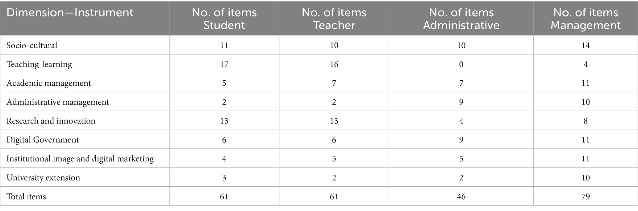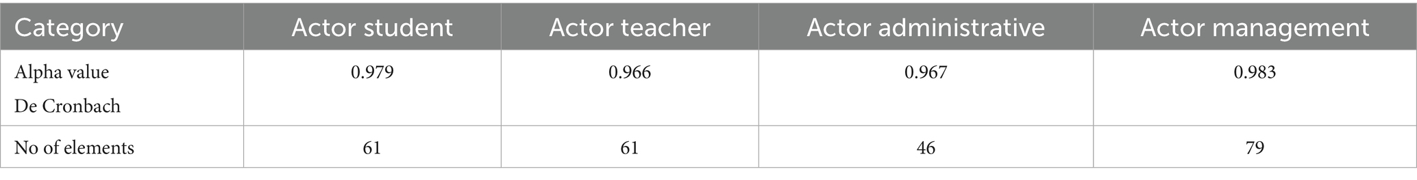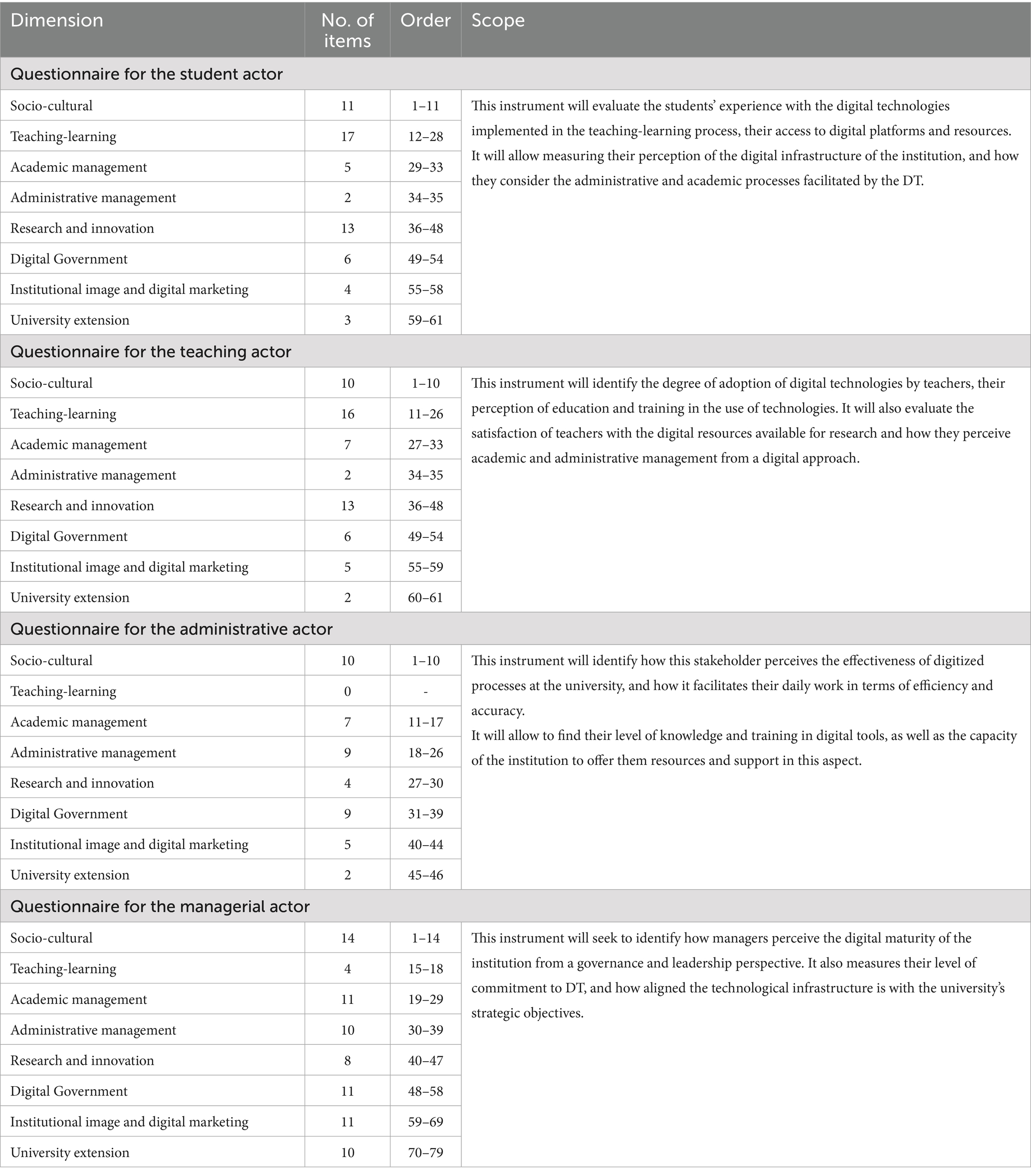 In a consolidated manner, according to Table 2, for the student and teacher actors, their instruments consist of 61 items. In the case of the administrative actor the instrument will have 46 items and for the managerial actor there will be 79 items. All the instruments are designed under the Likert scale with 5 response points that will allow to accurately evaluate the degree of maturity for each actor and dimension.