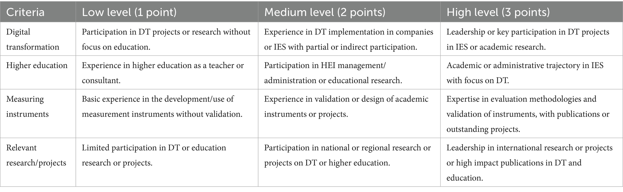 The matrix or table of competencies included the following criteria: Digital Transformation, Higher Education, measurement instruments and participation in relevant research and projects. Each criterion and its scores considered the experience and competencies of each expert (Table 3).