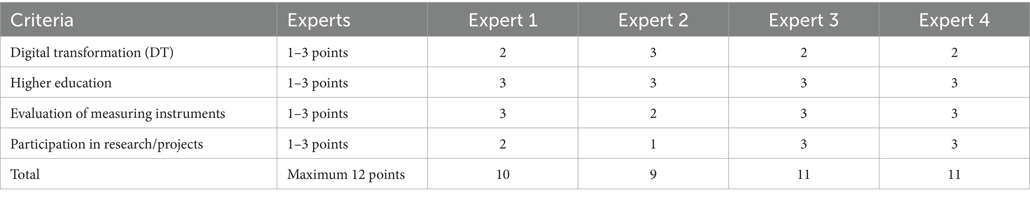 The competency matrix structure includes criteria for assessing the level of experience in digital transformation, higher education, evaluation of measurement instruments, and participation in research or projects. Each criterion was measured on a scale of 1 to 3 points.
