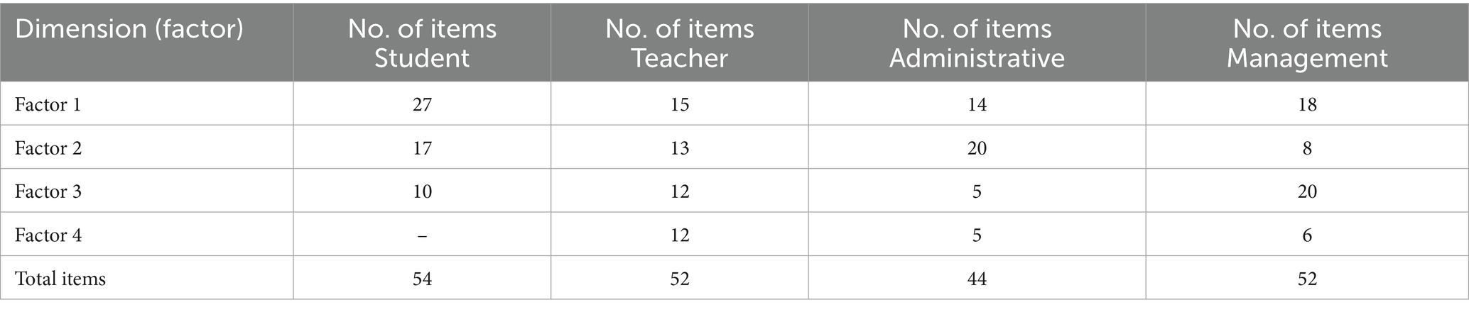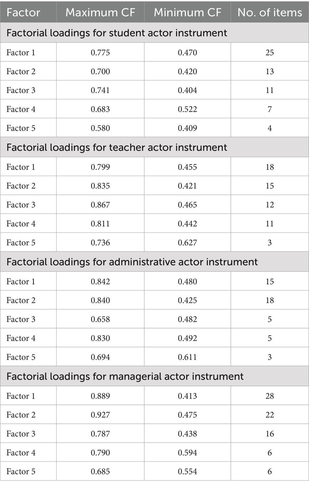 Given that the EFA was applied to small samples of teachers, administrators, and managers, the findings should be considered preliminary. Although there is evidence in the literature supporting the use of small samples, we recognize the need to confirm this factor structure through subsequent studies with larger, more representative samples in future research in order to reinforce the structural validity of the instruments.