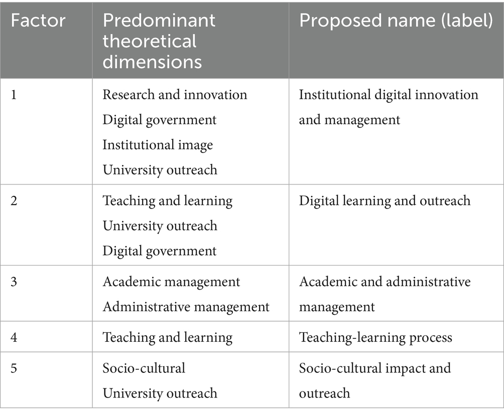 The exploratory factor analysis identified a differentiated factor structure in relation to the original instruments. For all EFAs in the four instruments, the total percentage of variance explained exceeded the required 50%, being considered adequate, and suggests that they effectively capture the main dimensions of digital transformation in the dimensions of an HEI, although some items originally assigned to specific dimensions were grouped into different factors, evidencing the need to adjust the initial instruments.