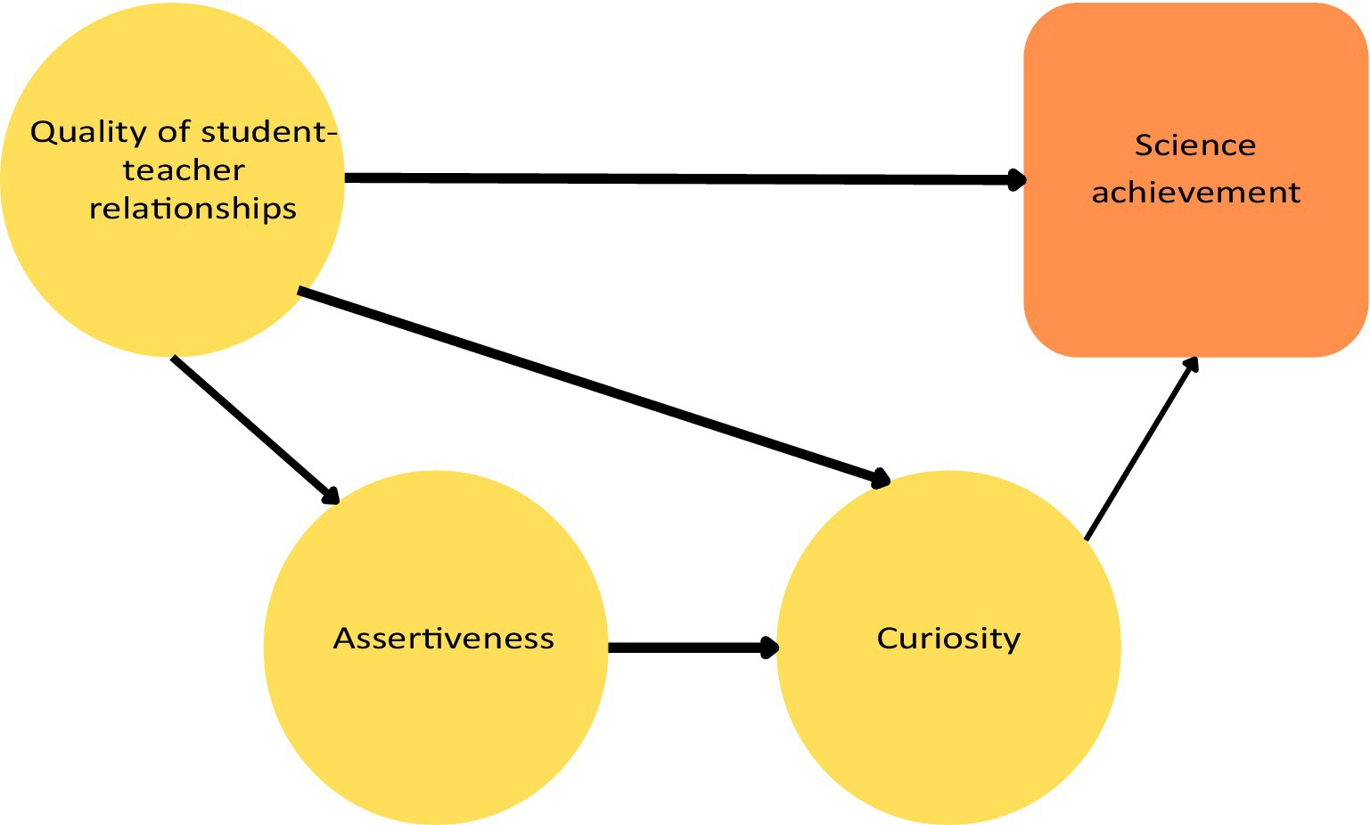 This study aims to fill this gap by examining the mediating roles of the student–teacher relationship, assertiveness, and curiosity in science achievement. The nature of the student–teacher relationship can directly influence students’ emotional engagement and motivation to learn, thus creating a safe and supportive environment for scientific exploration. A stable relationship with the teacher can strengthen assertiveness, as well as foster intellectual curiosity – both of which are closely linked to improved academic outcomes. In this context, the current research aims to examine how quality teacher relationships can foster assertiveness and curiosity in students, and how these two qualities mediate the impact of teacher relationships on science outcomes. Drawing on PISA 2022 data, this study provides an in-depth analysis that can contribute to the design of educational policies and the improvement of pedagogical practices that strengthen social and personal factors in students’ science achievements. This study is mainly focused on student–teacher relationships, assertiveness, and curiosity, as these emotional and motivational factors are identified as crucial mediators in achievements in science subjects. In comparison with immutable factors like intelligence and socio-economic status, these three factors are impactful through pedagogical interventions; therefore, they have particular importance for educational practices and school policies (Roorda et al., 2011; Oudeyer et al., 2016; Abu Khurma and El Zein, 2024).