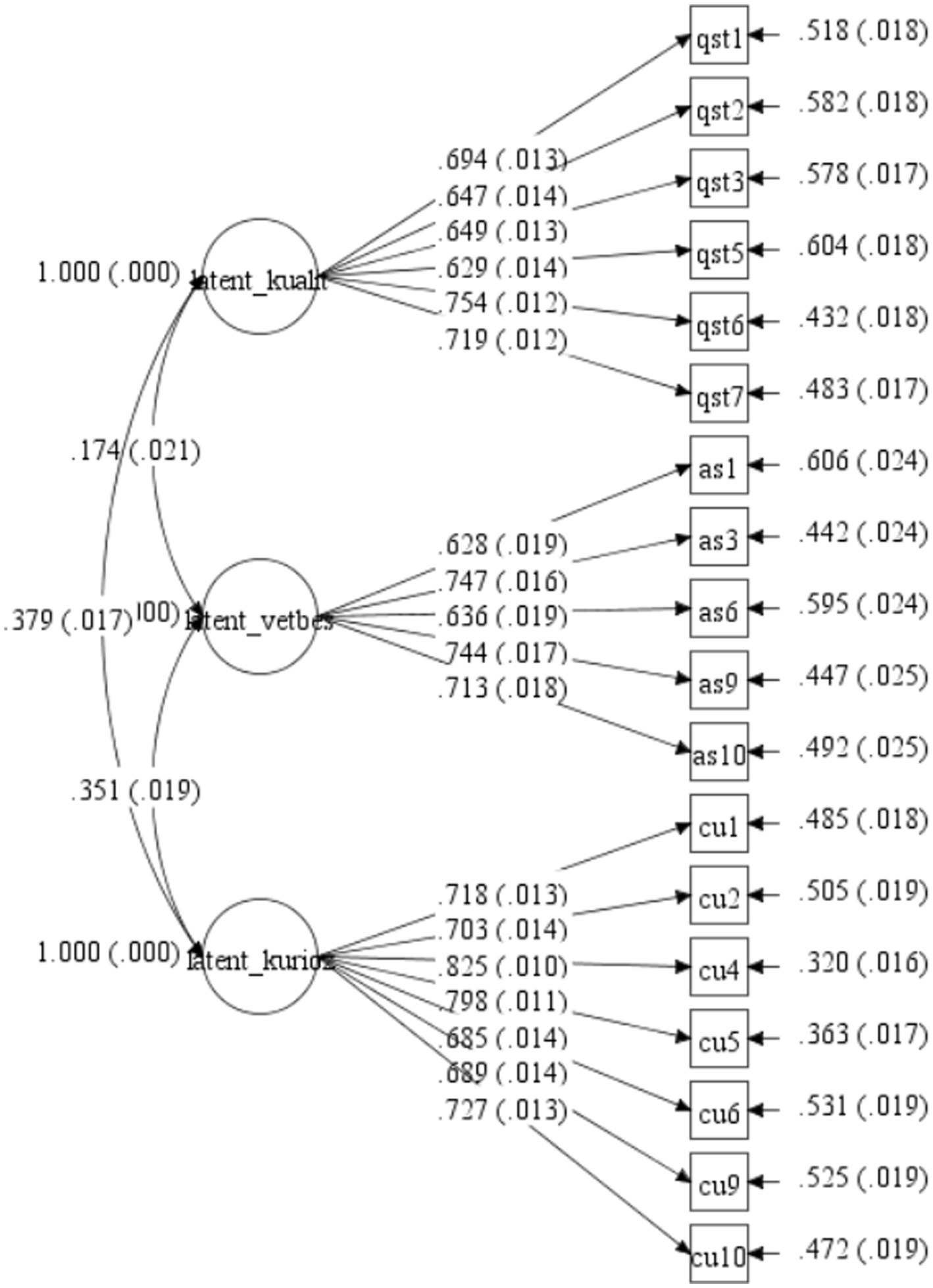 • latent_curious (student curiosity): cu1 (0.485), cu2 (0.505), cu4 (0.320), cu5 (0.363), cu6 (0.531), cu9 (0.525), cu10 (0.472). The internal loadings of the corresponding factors are: 0.718 (0.013), 0.703 (0.014), 0.825 (0.010), 0.798 (0.011), 0.685 (0.014), 0.689 (0.014), 0.727 (0.013). Although the remaining variables accurately represent curiosity, some loadings are lower (for instance, cu4 = 0.320), which suggests that this indicator is less robust compared to the others.