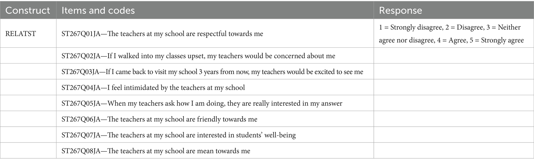 Quality of student–teacher relationships (RELATST)—students’ ratings of their agreement with the eight statements (e.g., “The teachers at my school are respectful towards me,” “When my teachers ask how I am doing, they are interested in my answer.”) in question ST267 were scaled into the index of “Quality of student–teacher relationships” (OECD, 2024, p. 437). Each of the eight items included in this scale had four response options (“Strongly disagree,” “Disagree,” “Agree,” “Strongly agree”). The data is taken from Table 19.A.22 titled “Items in the RELATST scale” presented in the OECD Report (2024).