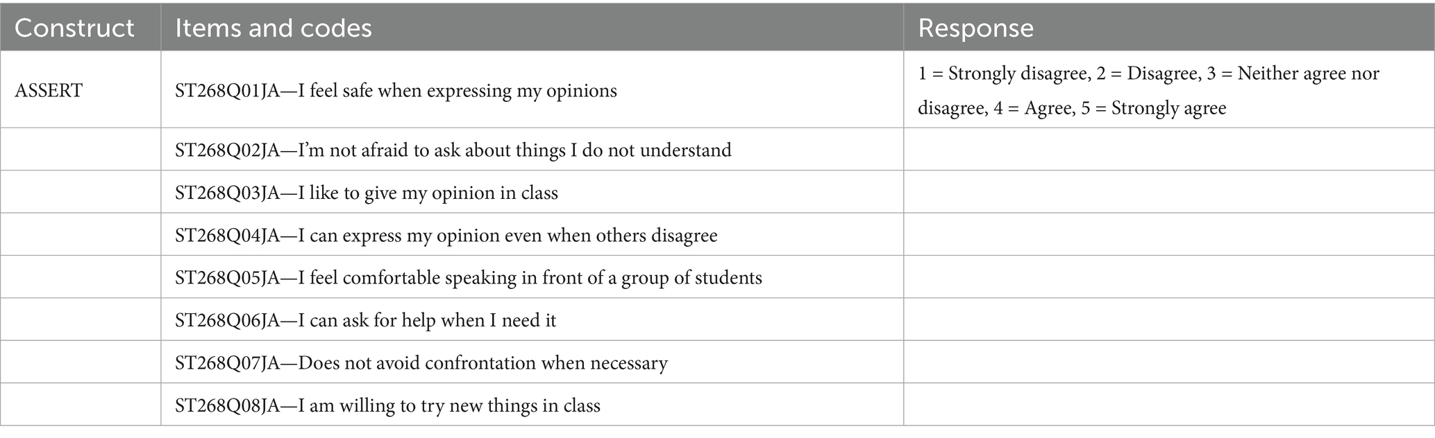 Assertiveness (ASSERAGR) students’ ratings of their agreement with statements about a range of behaviors indicative of assertiveness (e.g., “I take initiative when working with my classmates,” “I find it hard to influence people.”) in question ST305 were scaled into the index of “Assertiveness.” Each of the 10 items included in this scale had five response options (“Strongly disagree,” “Disagree,” “Neither agree nor disagree,” “Agree,” “Strongly agree”) (OECD, 2024, p. 439). The data is taken from Table 19.A.32 titled “Items in the ASSERAGR scale” presented in the OECD Report (2024).