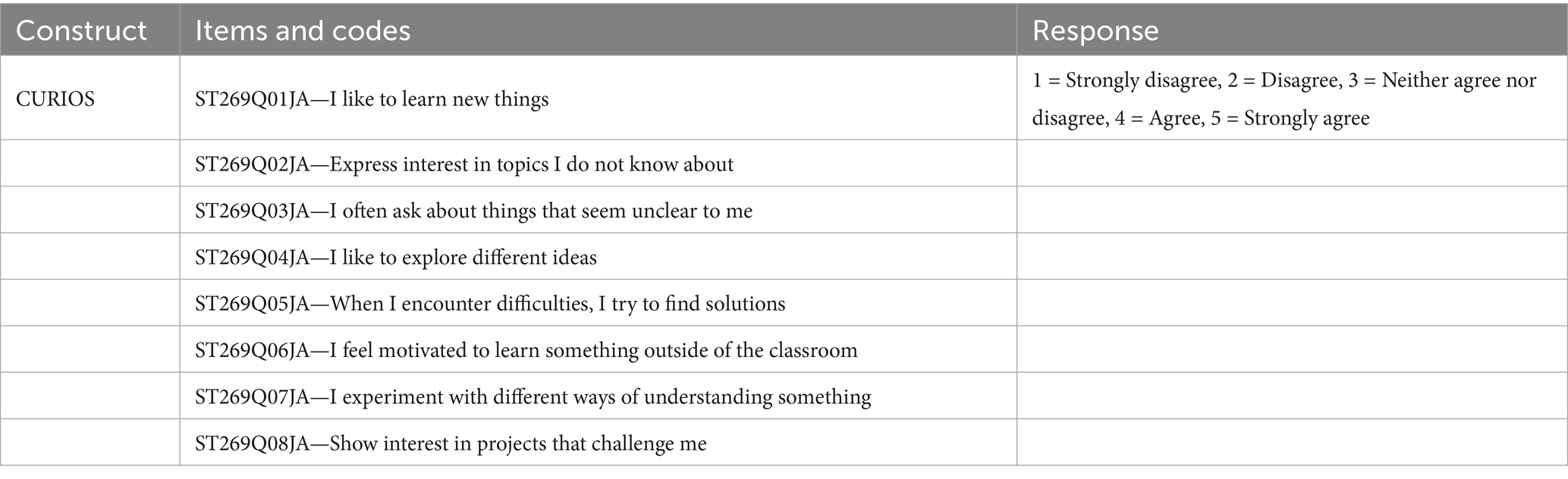 Curiosity (CURIOAGR) students’ ratings of their agreement with statements about a range of behaviors indicative of curiosity (e.g., “I like to know how things work,” “I am more curious than most people I know.”) in question ST301 were scaled into the index of “Curiosity.” Each of the 10 items included in this scale had five response options (“Strongly disagree,” “Disagree,” “Neither agree nor disagree,” “Agree,” “Strongly agree”) (OECD, 2024, p. 439). The data is taken from Table 19.A.35 titled “Items in the CURIOAGR scale” presented in the OECD Report (2024). Tables 1–3 show the different items for these variables.