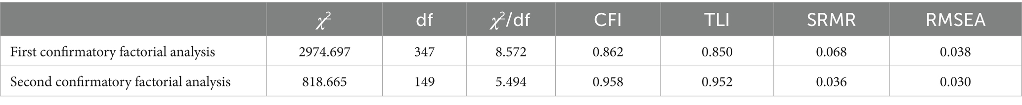 Table 1 displays the findings from the confirmatory factor analyses. The first analysis yielded a χ2 of 2974.697 with 347 degrees of freedom, a χ2/df ratio of 8.572, a CFI of 0.862, a TLI of 0.850 an SRMR of 0.068, and an RMSEA of 0.038. After removing poorly fitting items, the second confirmatory factor analysis (CFA) demonstrated substantial improvements in fit indices: χ2 of 818.665 with 149 degrees of freedom, χ2/df = 5.494, CFI = 0.958, TLI = 0.952, SRMR = 0.036, and RMSEA = 0.030. The CFI and TLI values exceeded the recommended threshold of 0.95, indicating a strong model fit. Moreover, the RMSEA and SRMR values were well within acceptable limits, further confirming the improved model fit.