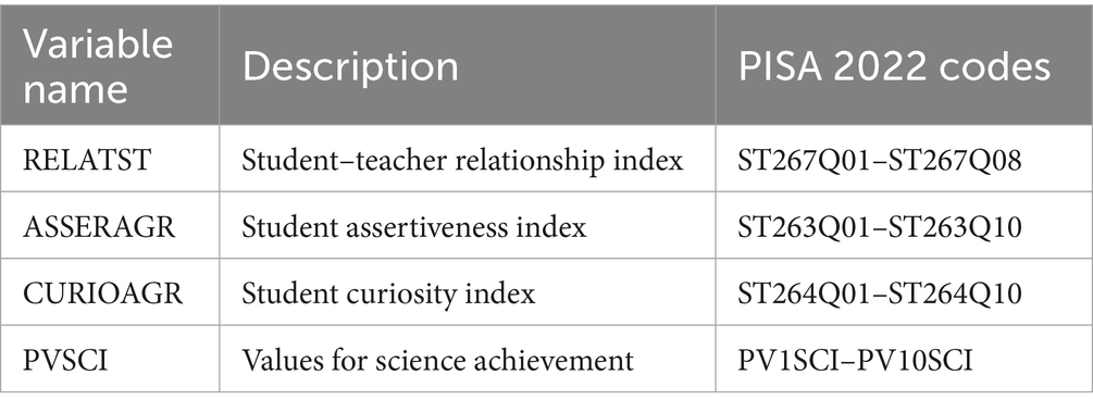 PISA 2022 covered member countries of the Organization for Economic Co-operation and Development (OECD) and several partner countries outside the organization. The program assesses the skills of 15-year-old students in three key areas: science, mathematics, and reading. Science education systems vary from country to country, including different curriculum structures, teaching approaches, teaching hours, and levels of laboratory equipment. This diverse context allows for the interpretation of student results in relation to teaching practice and factors influencing science learning. This study employs quantitative methodology using the secondary data from the OECD Report (2024) to statistically analyze the relationship between quality of student–teacher relationships (RELATST), assertiveness (ASSERAGR), curiosity (CURIOAGR) of students, and PVSCI (science achievement). A brief description of each variable, along with the items used to measure it and the rating scale is included below.