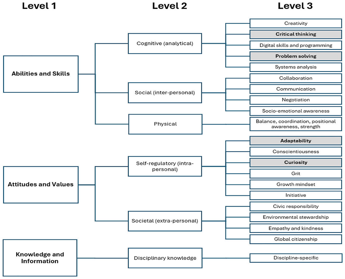 The Education 4.0 framework emphasizes the significance of abilities and skills in preparing learners for the future workforce. Studies have shown that problem-solving and critical thinking drive economic growth and innovation (Campo et al., 2023; Flores et al., 2020; Goczek et al., 2021). Employers across industries increasingly value these skills, highlighting the need for educational institutions to incorporate them into their curricula, from early childhood education to higher education. The framework also places a significant emphasis on the development of abilities and skills that are essential for navigating the complexities of our contemporary world. These capabilities encompass both cognitive and analytical aptitudes, such as creativity, critical thinking, and problem-solving, as well as interpersonal (non-cognitive) skills, including communication and collaboration. In a rapidly evolving job market, employers increasingly prioritize candidates who possess a diverse set of skills, ranging from technical proficiencies to socio-emotional competencies.
