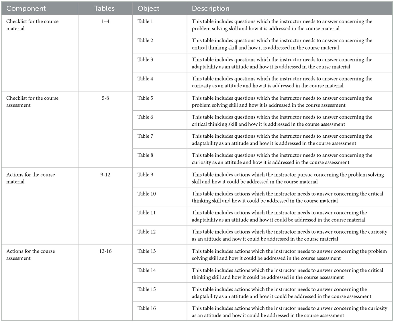 Table 1 provides an overview of the main components of E4CAM and illustrates how each part of the method connects to the core dimensions of the Education 4.0 framework. The sixteen tables are grouped into four categories; course material checklists, course assessment checklists, action plans for materials, and action plans for assessment; each addressing the four targeted competencies: problem-solving, critical thinking, adaptability, and curiosity. Together, these components guide instructors in evaluating and improving both the content and assessment elements of their courses in line with Education 4.0 competencies.