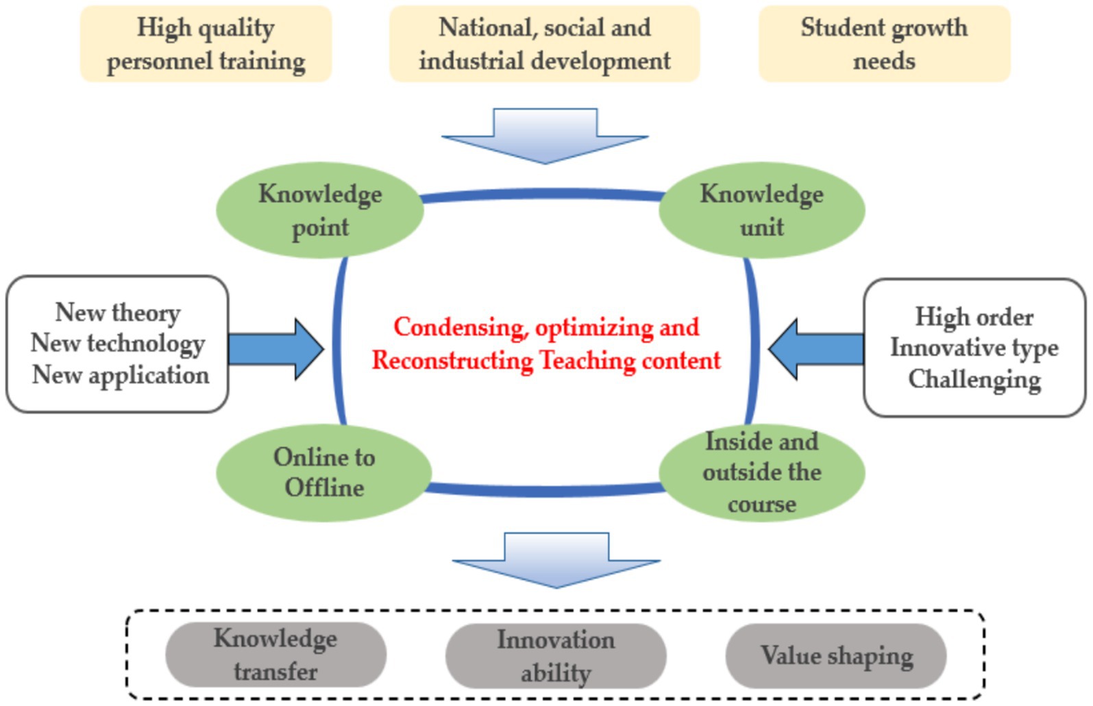 Optimizing and restructuring instructional content is a systematic endeavor where the teaching team focuses on the talent development objective of “knowledge-innovation-value.” They aim to revamp, modularize, functionalize, and compartmentalize knowledge units around core theoretical foundations and engineering issues (Bai et al., 2020). Figure 3 shows the principles for optimizing and reconstructing teaching content in this course. This includes: