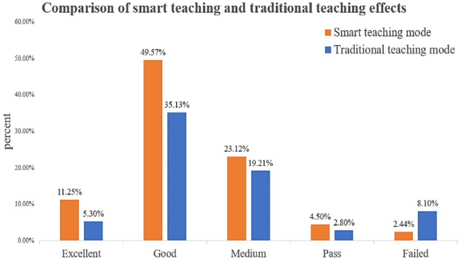 In this intelligent teaching process, we have achieved the following results in student skill development and teaching effectiveness: (1) The average exam score of students has increased from 78.35 to 83.61, representing a 5.26-point improvement. The percentage of students with excellent grades has increased by 6.15%, the percentage of students with satisfactory grades has increased by 14.24%, and the failure rate has decreased by 6.66%. Students have undertaken 39 provincial-level and above innovative and entrepreneurial projects, published 293 academic papers, obtained 17 authorized invention patents, and won 529 awards. This reflects the effectiveness of our teaching strategies in enhancing students’ learning motivation, self-directed learning skills, and innovative practical competencies. (2) We have developed high-quality provincial-level online courses and continuously provide online teaching services to more than 30 universities and approximately 900 learners in society. (3) We have disseminated our teaching experience through global live lectures, conference exchanges, and news publicity, among other means, to promote the development of education and professional disciplines.