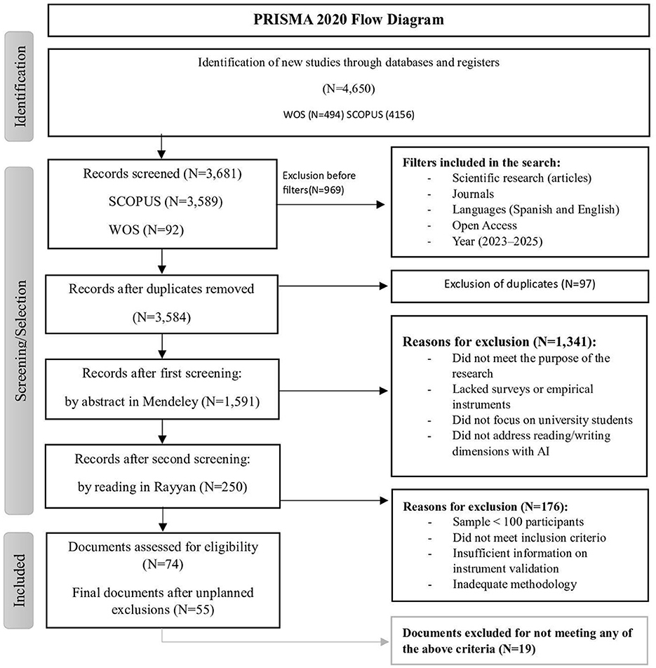 PRISMA 2020 flow diagram illustrating the selection process of studies. Starting with 4,650 records identified from WOS and SCOPUS, 969 were excluded by filters including scientific articles and specific years. After duplicate removal, 3,584 records remained. Following the first screening using Mendeley, 1,591 records were kept, narrowing to 250 after second screening with Rayyan. Reasons for exclusion included not meeting research purpose and lacking surveys. Final eligibility assessment left 74 records, with 55 remaining after exclusions. Nineteen documents were excluded for not meeting criteria.