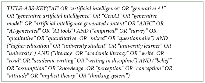The search was carried out in Scopus and Web of Science, selected for their breadth, up-to-date coverage, and relevance to education. A strategy was developed based on five blocks of key terms in the title-abs-key field: artificial intelligence, empirical methodology, educational level, academic literacy, and cognitive and attitudinal aspects. The search equation employed is presented in Table 1.