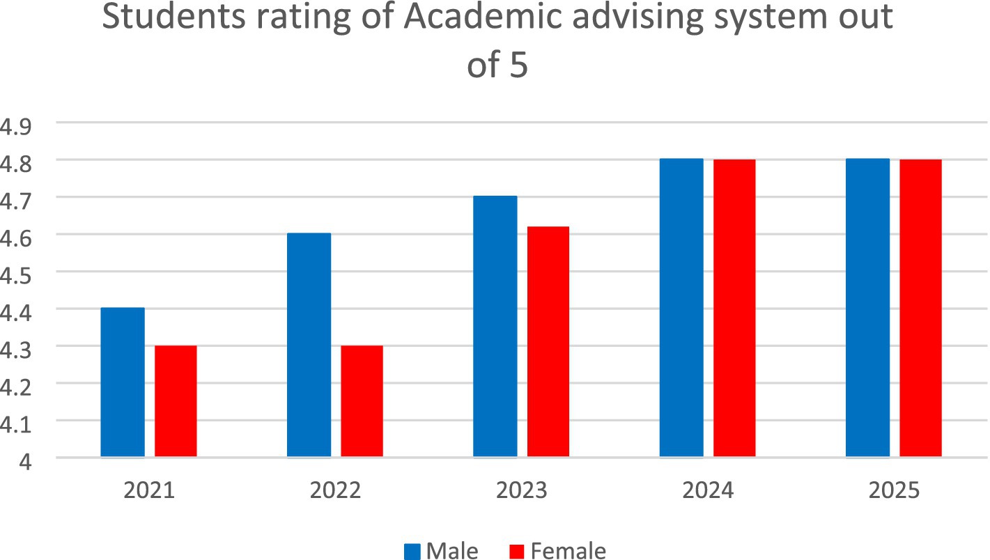 Over the past 5 years, student ratings of the academic advising system have provided valuable insights into the system’s effectiveness (Figure 2). The bar chart illustrates the students’ overall ratings of the academic advising system from 2021 to 2024, with separate data for male and female students. The ratings showed a positive trend over time. In 2021, both sexes rated the system at approximately 4.4; however, by 2022, male students’ ratings increased to approximately 4.6, while female students reached approximately 4.5. The upward path continued in 2023, with male students rating the system around 4.7 and female students achieving similar ratings. In the last 2 years, both groups maintained high satisfaction levels, ranging from 4.6 to 4.8. These results indicate a growing appreciation of the academic advising system, reflecting improvements in the quality of support provided to students.