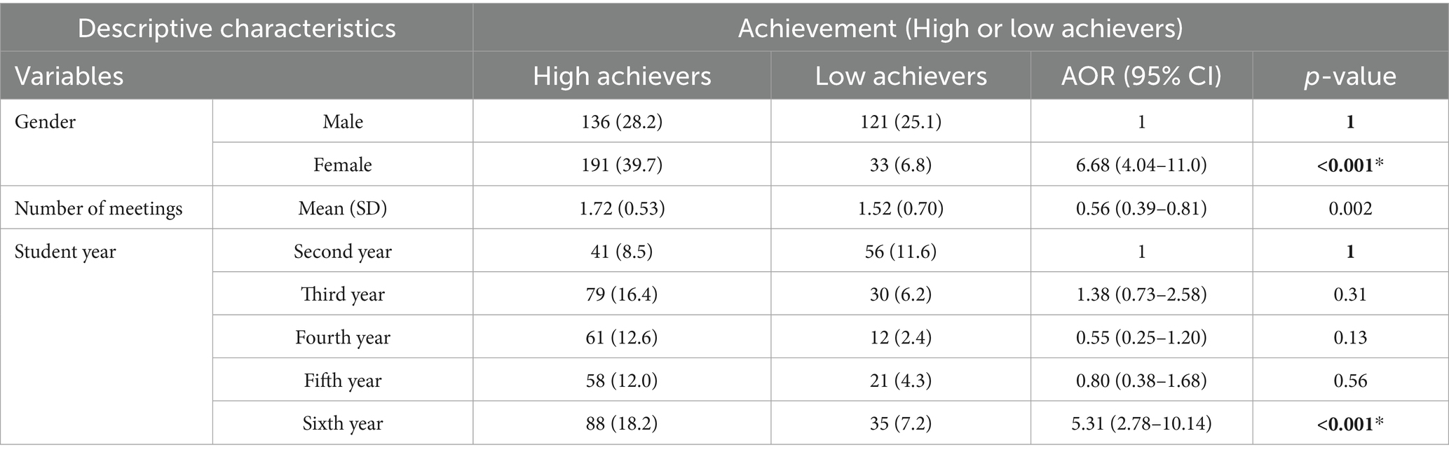 The regression analysis in Table 4 examines the factors affecting student achievement at KAU Dental College in 2024 by comparing high and low achievers among 481 undergraduates. The regression equation for analyzing student achievement, considering gender, year of study, and the number of academic advising meetings, can be expressed as Y = β_0 + β_1 “(Gender)” + β_2 “(Year of Study)” + β_3 “(Number of Meetings)” + ϵ, where Y indicates achievement levels, and statistical significance is set at p < 0.05. The analysis included sex, number of academic-advising meetings, and year of study as predictor variables. The results indicate that female students are significantly more likely to be high achievers, with an adjusted odds ratio (AOR) of 6.68 (95% CI: 4.04–11.01, p < 0.001). Additionally, the number of academics advising meetings is positively associated with achievement; students who attended more meetings had higher odds of being high achievers (AOR = 0.56, 95% CI: 0.39–0.81, p = 0.002). Regarding academic year, sixth-year students showed a significantly greater likelihood of high achievement compared to second-year students (AOR = 5.31, 95% CI: 2.78–10.14, p < 0.001). These findings highlight the importance of academic advising, sex, and academic progression in influencing student performance, and suggest that targeted support strategies should be tailored accordingly.